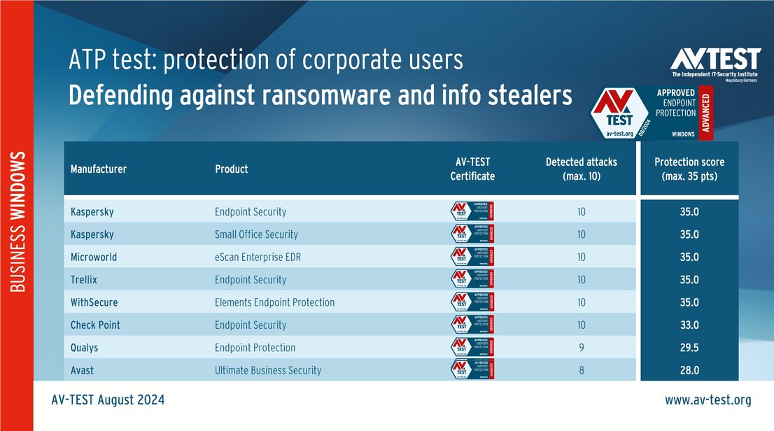 8 solutions for corporate users also took part in the advanced ATP test. A total of 5 products achieved the maximum 35 points for their protection score, thanks to their error-free protection performance: Kaspersky's Endpoint Security and Small Office Security, Microworld eScan Enterprise EDR, Trellix Endpoint Security and WithSecure Elements Endpoint Protection.
