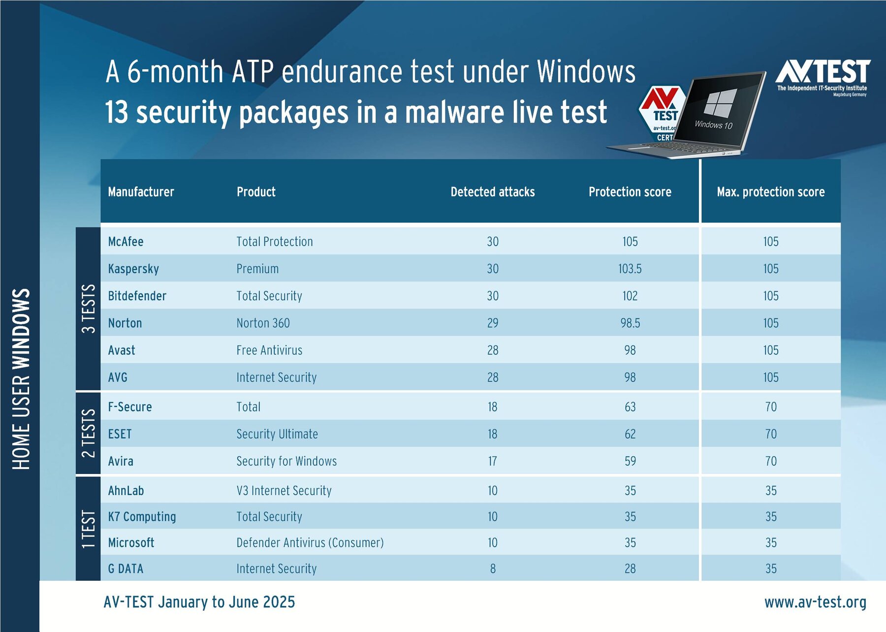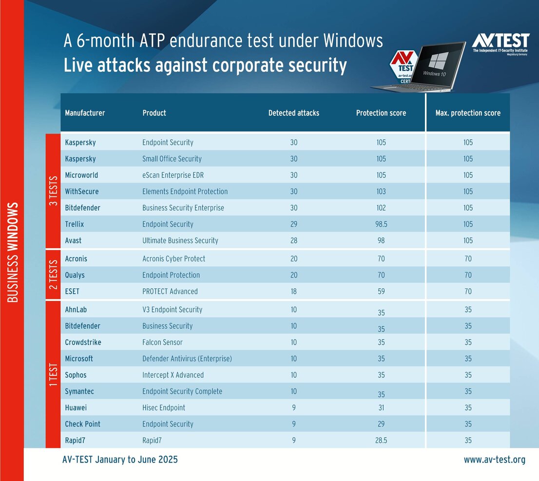When it comes to purchasing a new security solution, those responsible for corporate procurement pay just as much attention to reliable test data as do consumer users. That is why the latest ATP endurance test of 32 products under Windows is a trove of incontrovertible test data. It provides a sound assessment of the many security solutions available on the market. The AV-TEST lab collected test findings from January through the end of June 2025. A large number of products took part in all 3 tests, others only in 2 or one. Nevertheless, it enabled a good side-by-side comparison of the products.