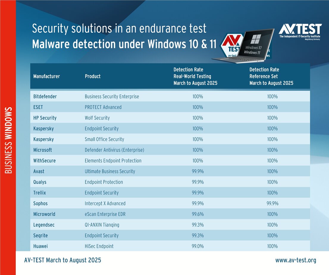 This is why companies need to ensure the highest level of cybersecurity possible. The endpoint security solution, which many have declared as dead, still forms the core of security solutions for companies. And now a new concern arises: Microsoft will no longer provide companies with security updates for their Windows 10 systems unless they first register for extended security updates (ESU). Some companies are only now starting to plan the migration of their systems to Windows 11. But does the customer’s specific endpoint solution protect their clients under the new version of Windows just as reliably as under the old version? This question is the focus of the current endurance test with 15 solutions for corporate users. The test took place from March to August 2025 and evaluated the products under Windows 10 and 11.