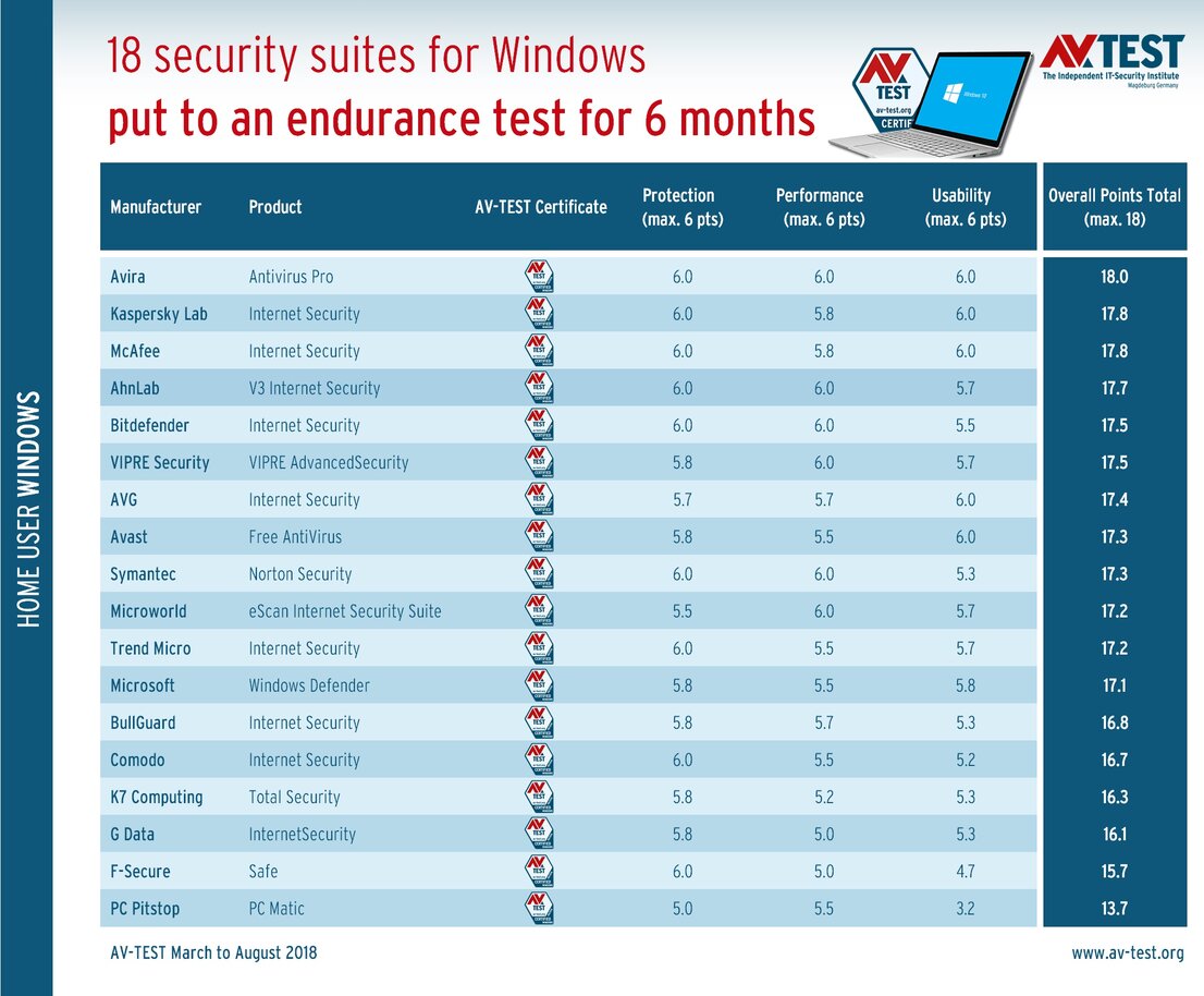 In the endurance test from March to August 2018, the lab evaluated a total of 18 protection packages for Windows. During the test, 12 of the 18 products tested averaged 17 to 18 points – those are top results. Still, it deserves to be mentioned that Avira Antivirus Pro was the only product to achieve the full 18 points.