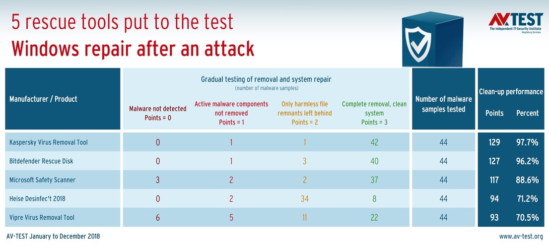 In the laboratory, every user's worst nightmare occurred hundredfold: Windows is overrun by malware that becomes embedded in the system. Afterwards, the lab examined whether Internet security suites or special tools could liquidate the intruders and restore the systems to a clean and secure condition. The sophisticated laboratory test was conducted from January to December 2018 in 4 major test rounds. The experts evaluated 7 protection packages and 5 special tools in more than 830 individual tests.