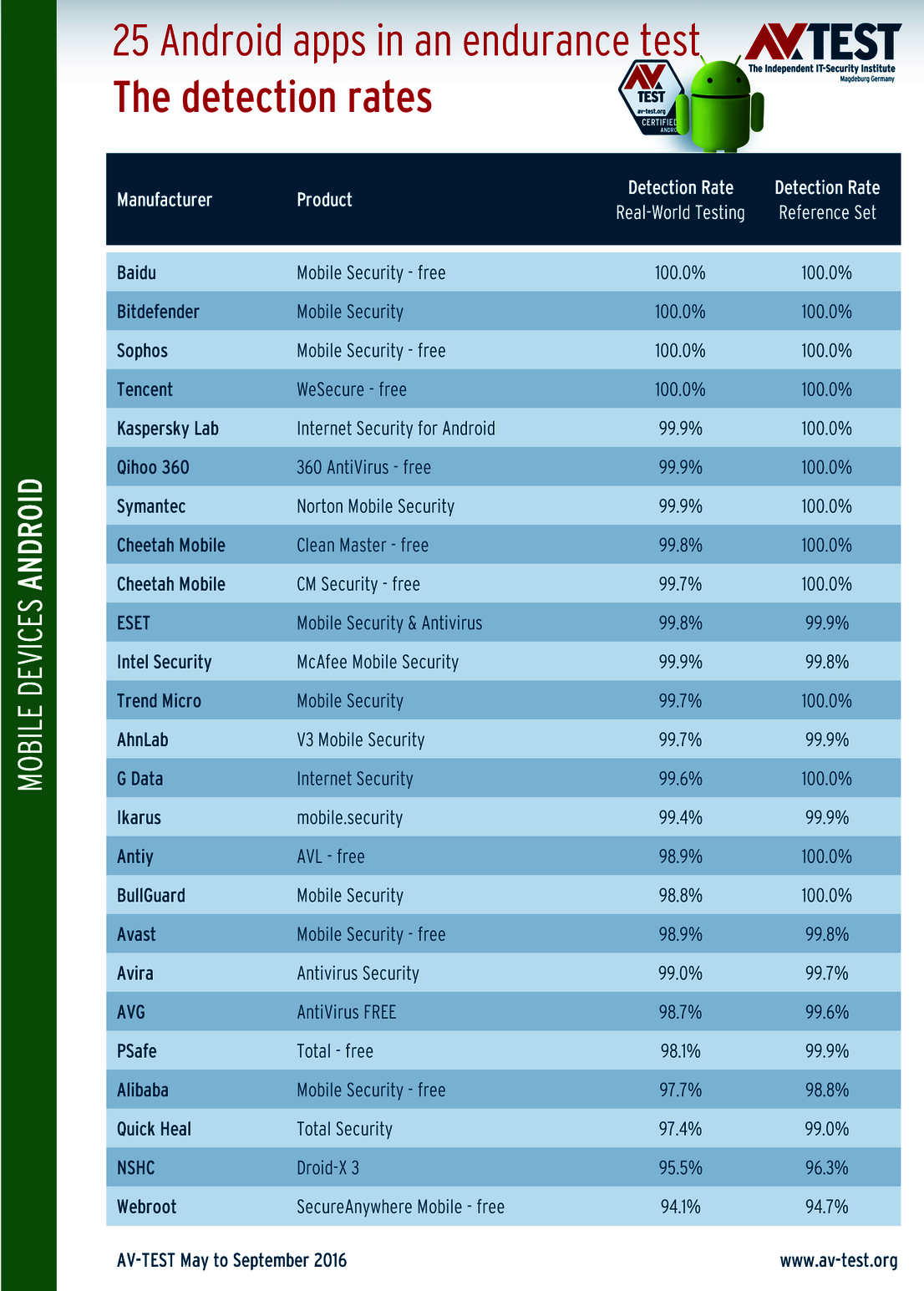 In terms of protection performance, the apps have always been tested in two phases. First, the objective was to pass the real-time test, in which infected apps, some totally new and some merely a few hours old, are required to be detected and filtered out. Overall, this included over 10,500 apps. In the second test phase, the objective was to detect and remove the malware apps in the reference set. These apps with malware are extremely dangerous and at the time of the relevant test launch, they are a maximum of 4 weeks old. In total, the sets contain an additional 10,500 apps.