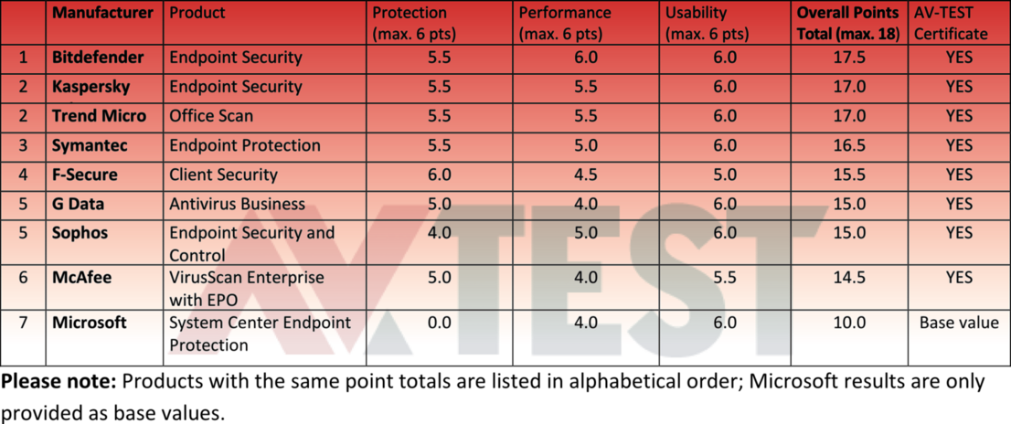 The highest attainable point score for protection, performance (system load) and usability was 18 points. The security solution from Bitdefender came in just shy of a perfect score with 17.5 points. This was followed by the enterprise system watchdogs from Kaspersky Lab and Trend Micro, scoring 17 points each. Symantec came in 3rd place with a total of 16.5 points.