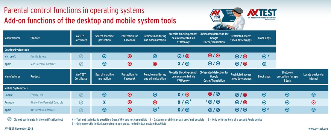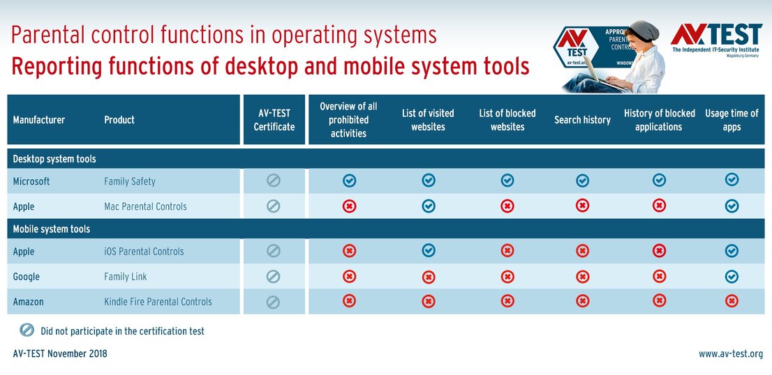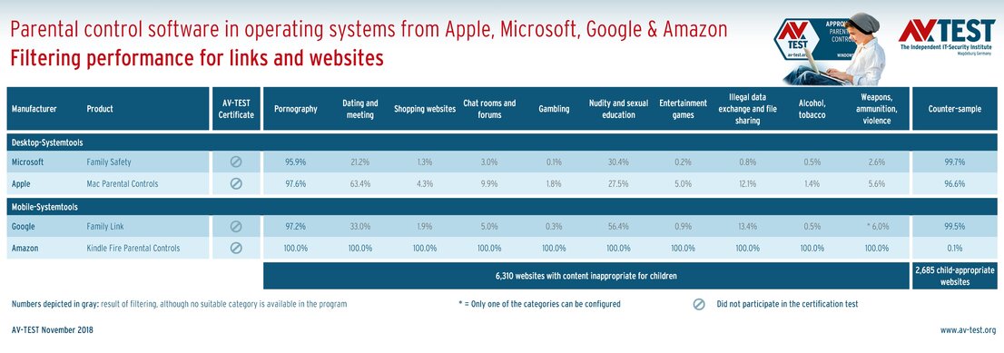 The test evaluated the following: Windows 10, MacOS High Sierra, Android 8.0, iOS 12 and Fire OS from Amazon; that is an adapted Android system. Each system has internal functions, and the desktop systems have add-on software. The exact product names were: Microsoft Family Safety, Mac Parental Controls, Google Family Link, iOS Parental Controls and Kindle Fire Parental Controls.