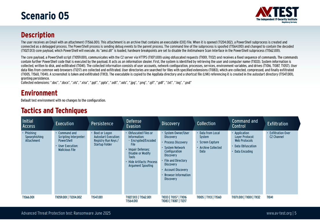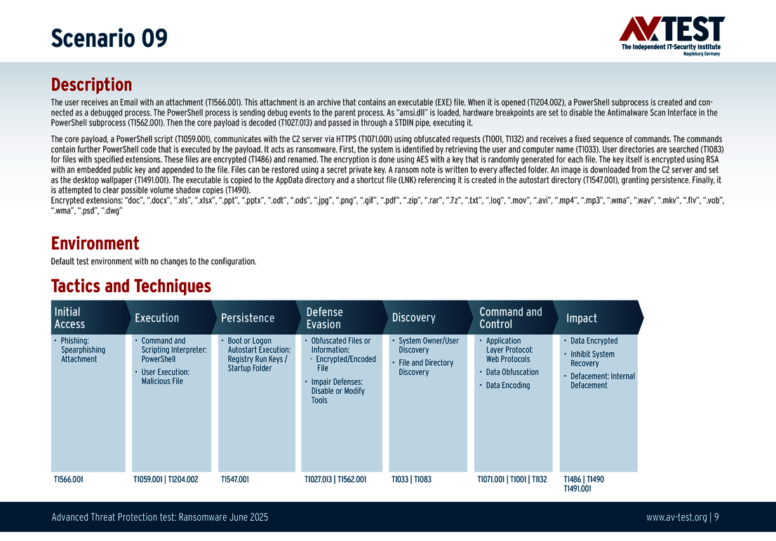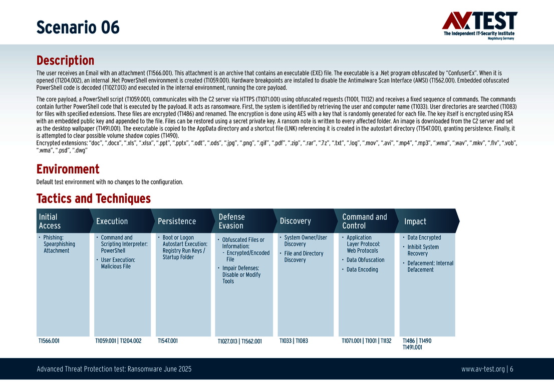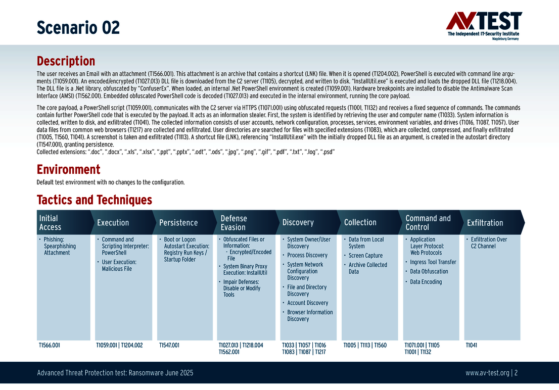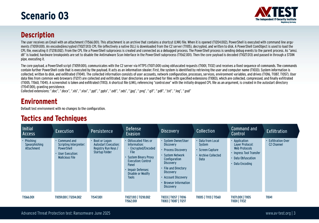 All attack scenarios are documented according to the standard of the MITRE ATT&CK database. The individual sub-techniques are listed in the MITRE database for "Techniques", for example "T1566.001" under "Phishing: Spearphishing Attachment". Each test step is thus defined among the experts and can be logically understood. In addition, all attack techniques are explained, along with how successful the malware is.