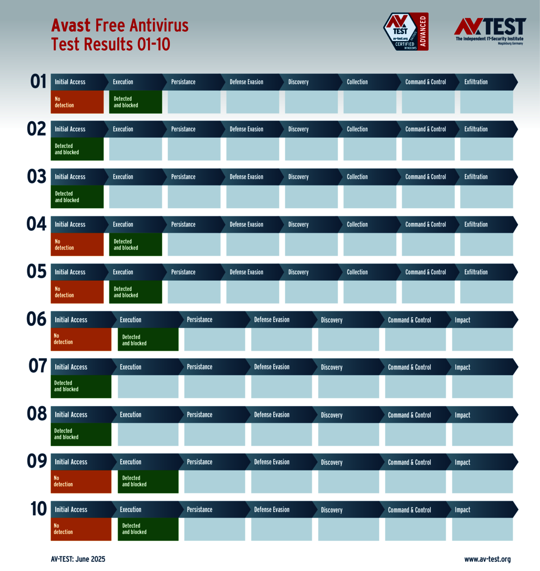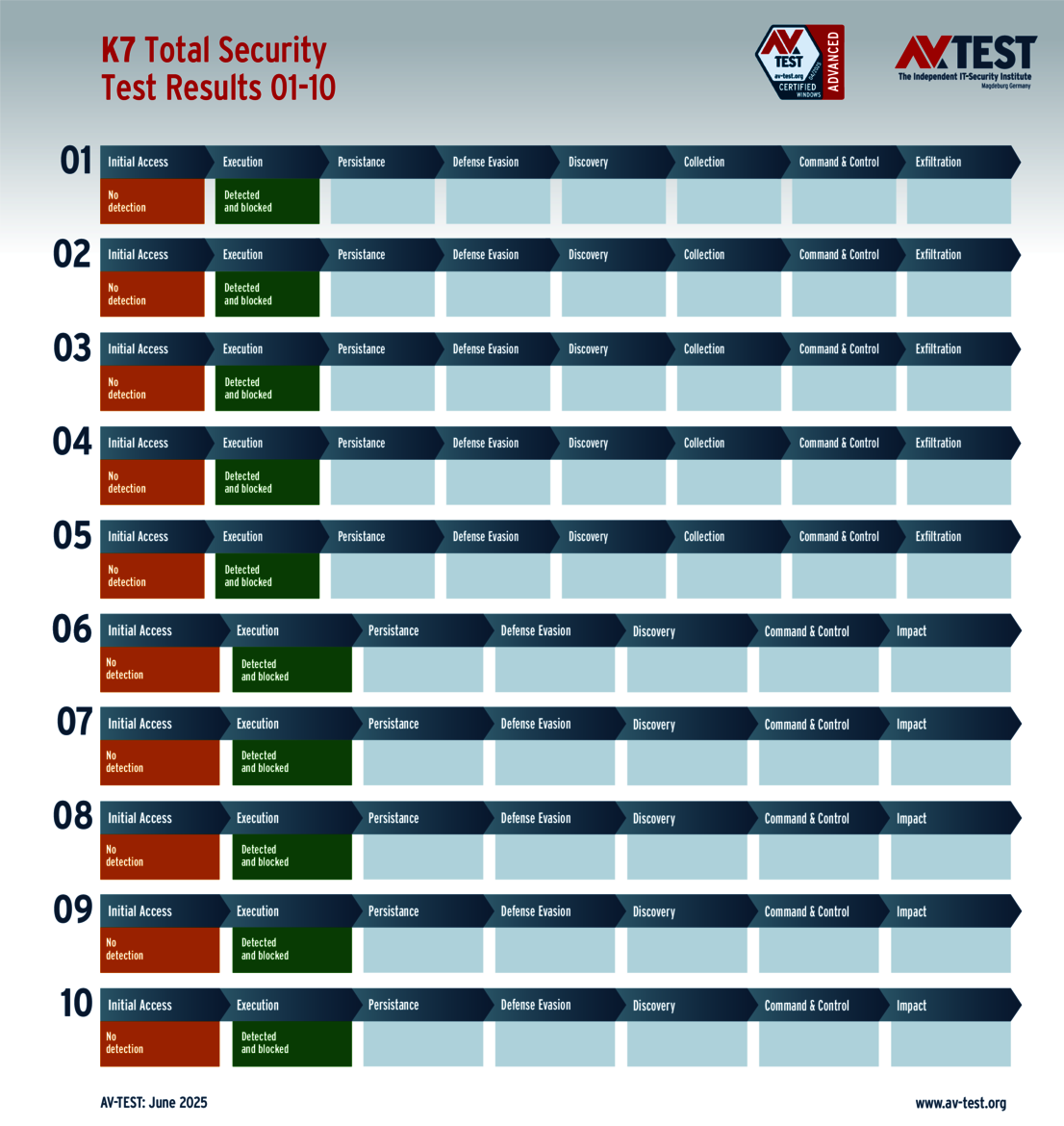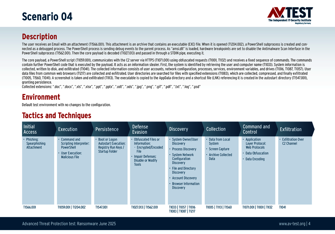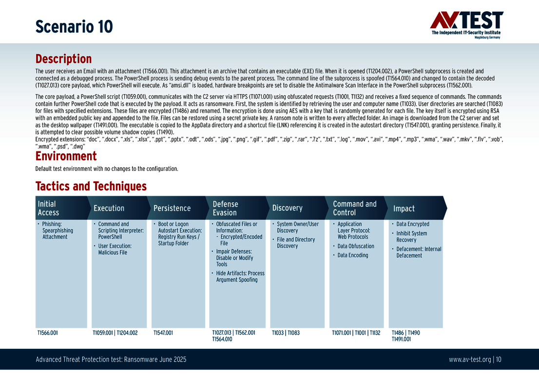 All attack scenarios are documented according to the standard of the MITRE ATT&CK database. The individual sub-techniques are listed in the MITRE database for "Techniques", for example "T1566.001" under "Phishing: Spearphishing Attachment". Each test step is thus defined among the experts and can be logically understood. In addition, all attack techniques are explained, along with how successful the malware is.