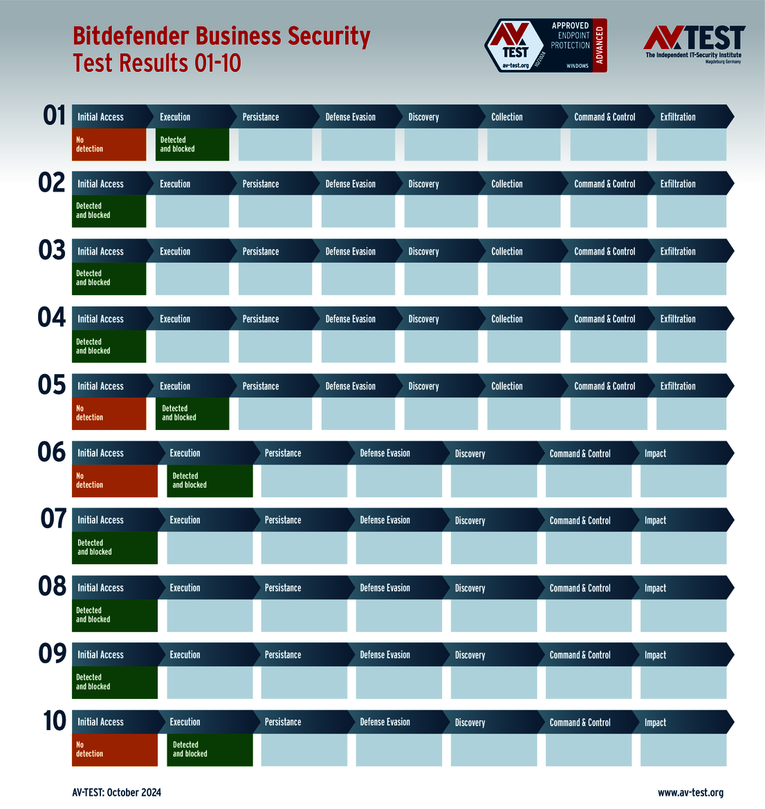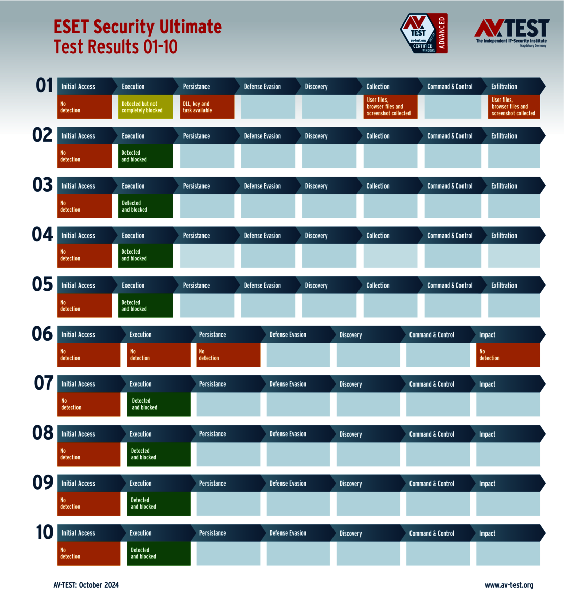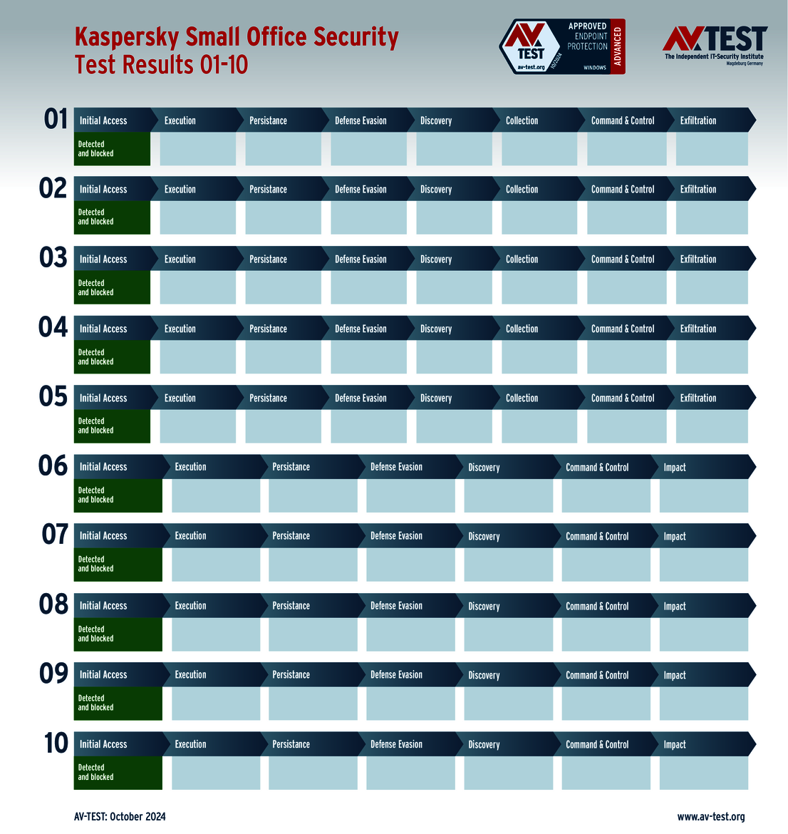 All attack scenarios are documented according to the standard of the MITRE ATT&CK database. The individual sub-techniques are listed in the MITRE database for “Techniques”, for example “T1566.001” under “Phishing: Spearphishing Attachment“. Each test step is thus defined among the experts and can be logically understood. In addition, all attack techniques are explained, along with how successful the malware is.