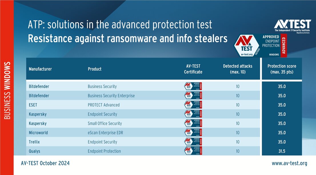 A total of 12 products faced off in the Advanced Threat Protection test: Antivirus programs for consumer users included the packages from Bitdefender, ESET, McAfee and NPAV. Solutions for corporate users involved a line-up of products from the following manufacturers: Bitdefender (with 2 versions), ESET, Kaspersky (with 2 versions), Microworld, Qualys and Trellix. All the data was collected and evaluated in September and October 2024 under Windows 11.