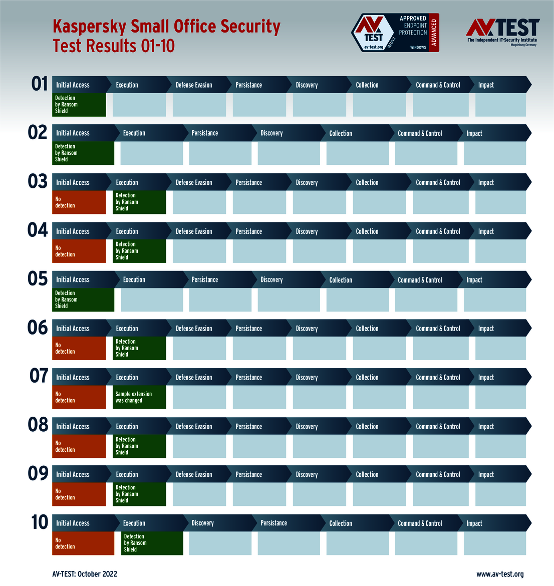The corporate user products demonstrated better performance: 10 of the 12 products immediately detected all attackers and fended them off completely: Avast, Bitdefender, Bitdefender Ultra, Check Point, Xcitium, Kaspersky Endpoint Security, Kaspersky Small Business Security, Microsoft, WithSecure and VMware. The additional two solutions had problems, which led to partial encryptions.