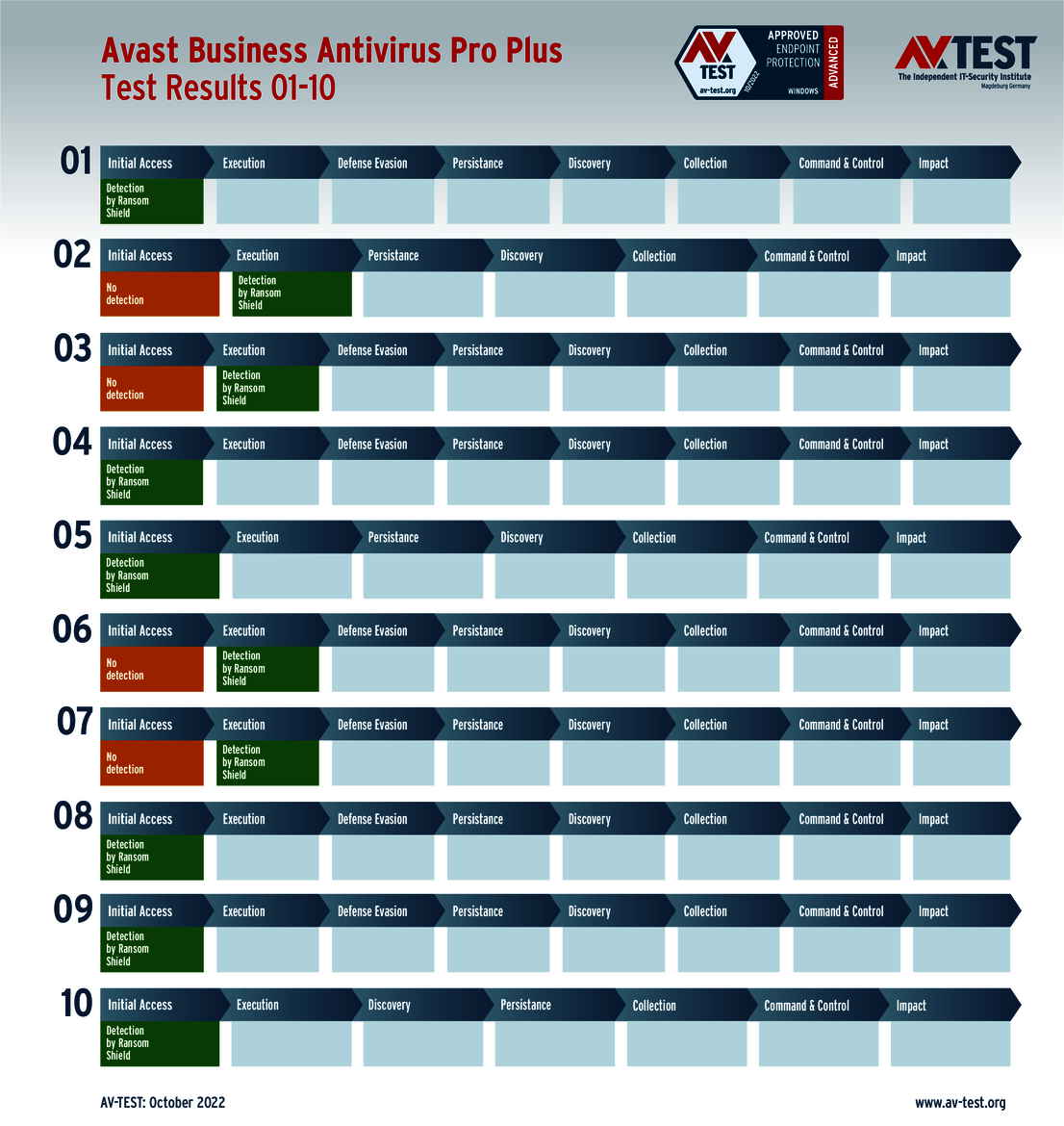 Avast with One Essential, AVG, Bitdefender, F-Secure, Kaspersky, Microsoft, Microworld and PC Matic detected all special attack techniques of the various 10 ransomware scenarios and received the maximum 30 points for the protection score.