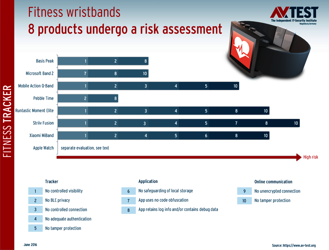 Fitness wristbands and smart watches are extremely popular, not only with sports fans. Health insurance companies are now even subsidizing the purchase of a tracker or rewarding their use, as fit people cost the insurance companies less. That is why the experts from AV-TEST examined 7 of the latest fitness wristbands under Android and the Apple Watch in terms of their security. The result: some manufacturers are continuing to make disappointing errors.