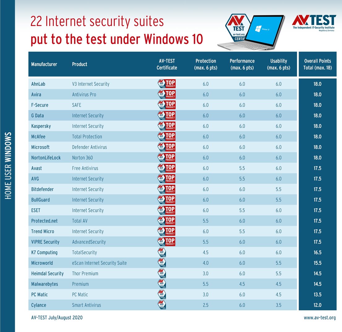 The other six packages still managed to earn between 16.5 and 12 points. The test involved the Internet security suites and antivirus protection packages from AhnLab, Avast, AVG, Avira, Bitdefender, BullGuard, Cylance, ESET, F-Secure, G Data, Heimdal Security, K7 Computing, Kaspersky, Malwarebytes, McAfee, Microsoft, Microworld, NortonLifeLock, PC Matic, Protected.net, Trend Micro, and VIPRE Security.