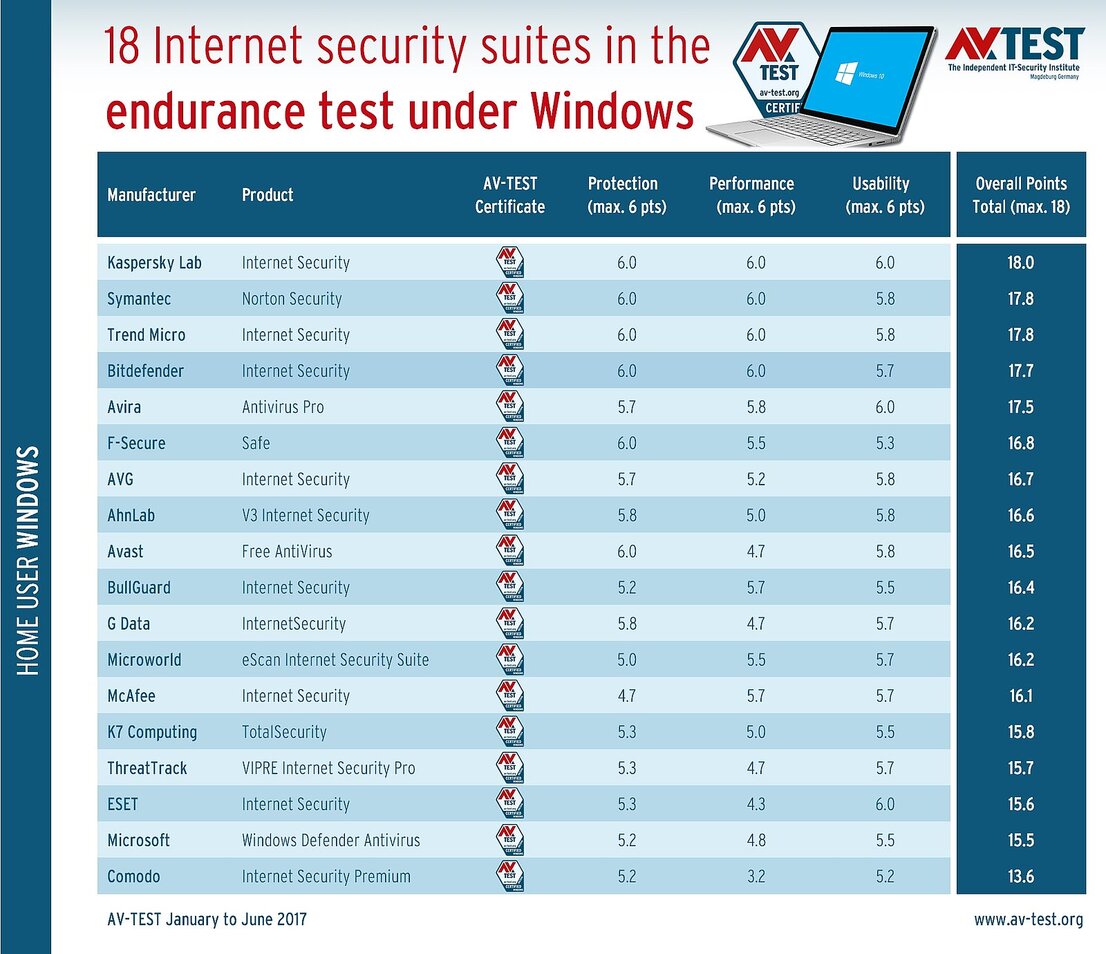 The endurance test makes choosing the best protection package a difficult task, as there is a wide selection of dependable products. Those who go according to the overall point score are advised to choose the security solutions from Kaspersky Lab, Symantec, Trend Micro, Bitdefender and Avira. They reached between 17.5 and 18 maximum points.