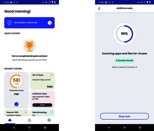 | Protección en tiempo real contra ataques del malware más reciente a dispositivos Android 2.705 muestras utilizadas | 99,7% | 99,6% |