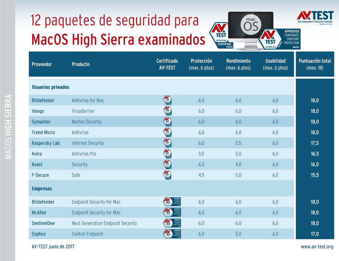 Entre las 12 soluciones de seguridad para MacOS High Sierra examinadas había 8 para usuarios privados y 4 para empresas.
