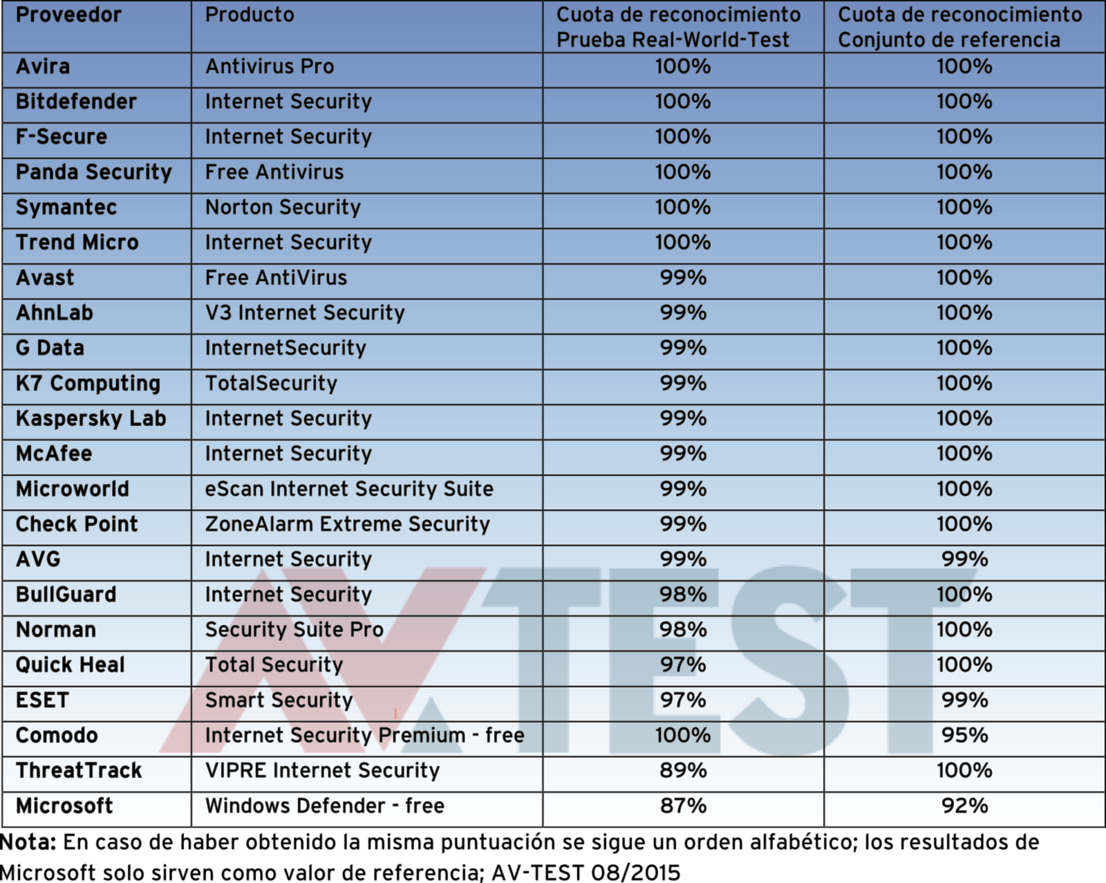 AV-TEST analizó 22 soluciones de seguridad y puede recomendar la mayoría de ellas (AV-TEST, versión de agosto de 2015).