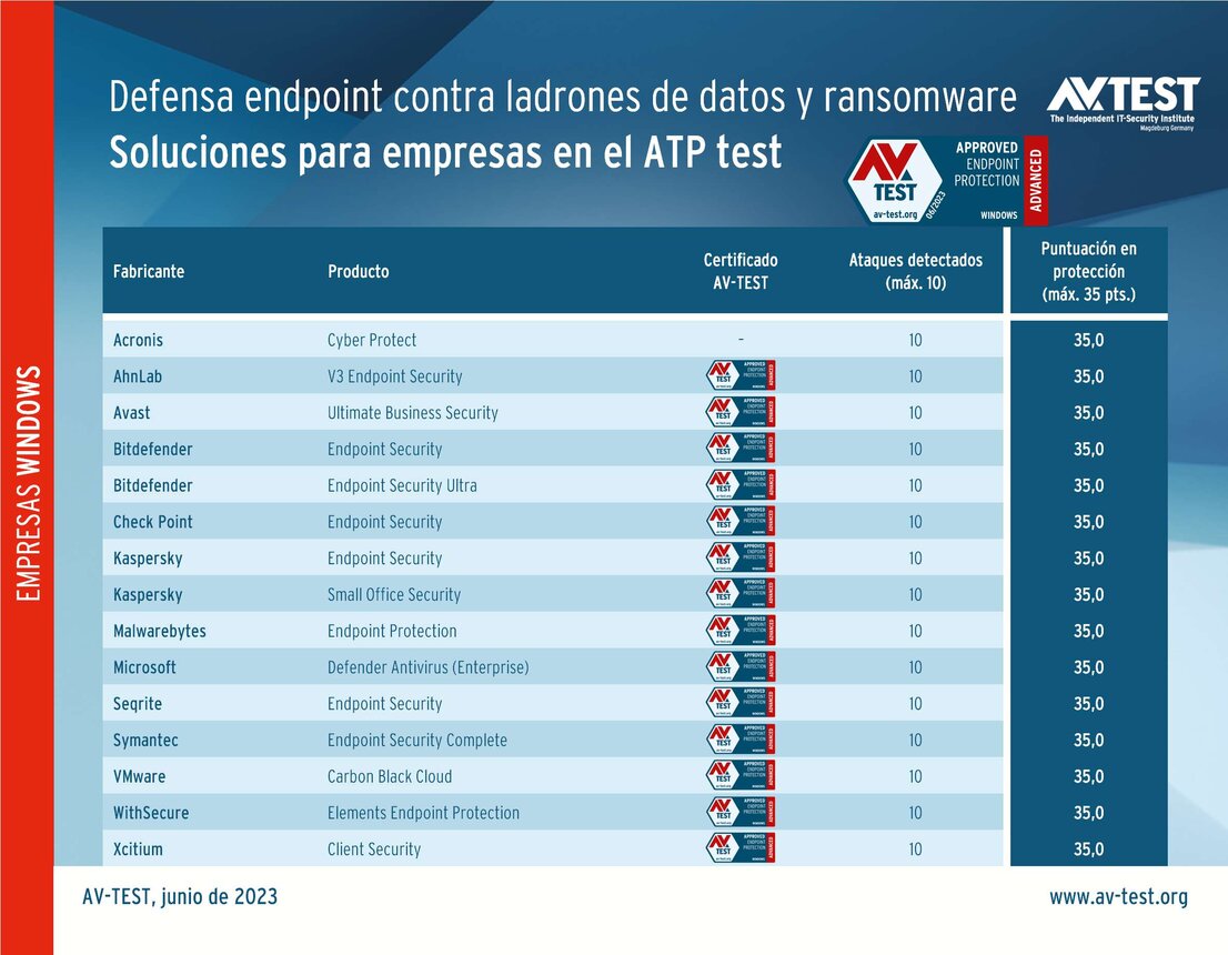 Las 15 soluciones de seguridad para empresas provienen de los fabricantes Acronis, AhnLab, Avast, Bitdefender (con 2 versiones), Check Point, Kaspersky (con 2 versiones), Malwarebytes, Microsoft, Seqrite, Symantec, VMware, WithSecure y Xcitium