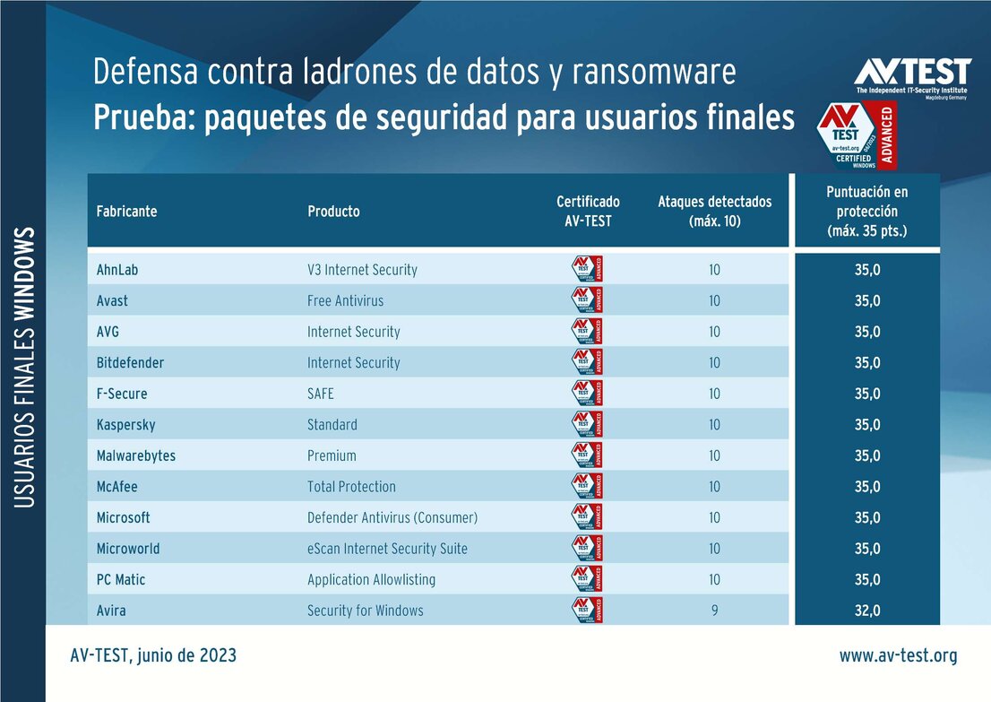 Casi todos los paquetes de seguridad para usuarios privados obtuvieron un resultado perfecto en la prueba ampliada contra ladrones de datos y ransomware y la máxima puntuación en protección de 35 puntos.