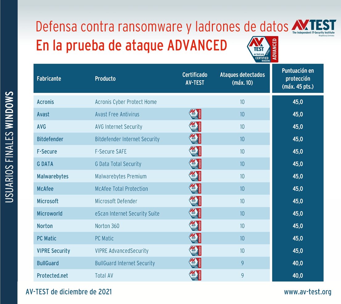 En diciembre de 2021, un total de 15 productos de seguridad para usuarios privados se sometieron en el laboratorio a 10 escenarios de ataque con ransomware y ladrones de datos bajo Windows 10. En total, 13 de los 15 productos finalizaron la prueba con un resultado perfecto de 45 puntos: Acronis Cyber Protect Home, Avast Free Antivirus, AVG Internet Security, Bitdefender Internet Security, F-Secure SAFE, G Data Total Security, Malwarebytes Premium, McAfee Total Protection, Microsoft Defender, Microworld eScan Internet Security Suite, Norton 360, PC Matic y VIPRE AdvancedSecurity. Los gráficos muestran claramente que reconocieron y bloquearon los ataques de inmediato.