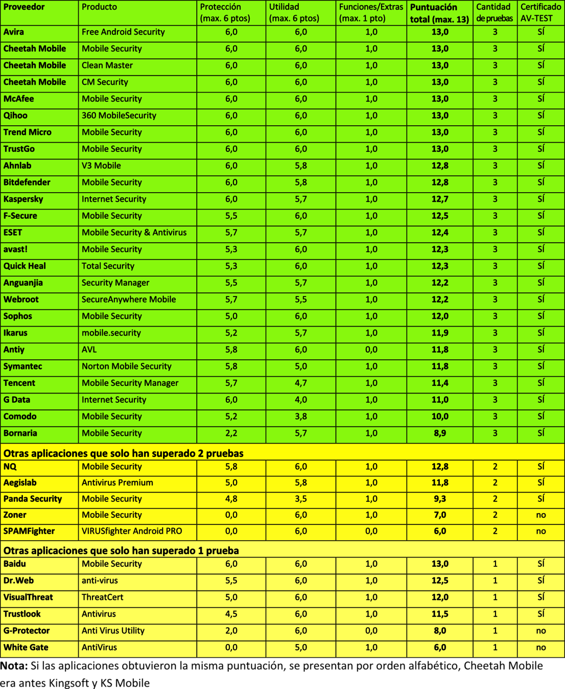 Las aplicaciones con el mejor nivel de protección son las de Ahnlab, Antiy, Avira, Bitdefender, Cheetah Mobile (tres versiones), G Data, Kaspersky, McAfee, Qihoo, Symantec, Trend Micro y TrustGo.