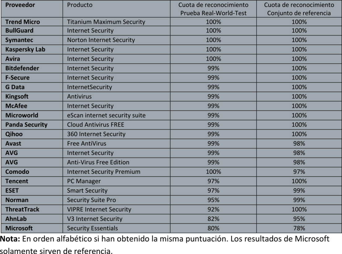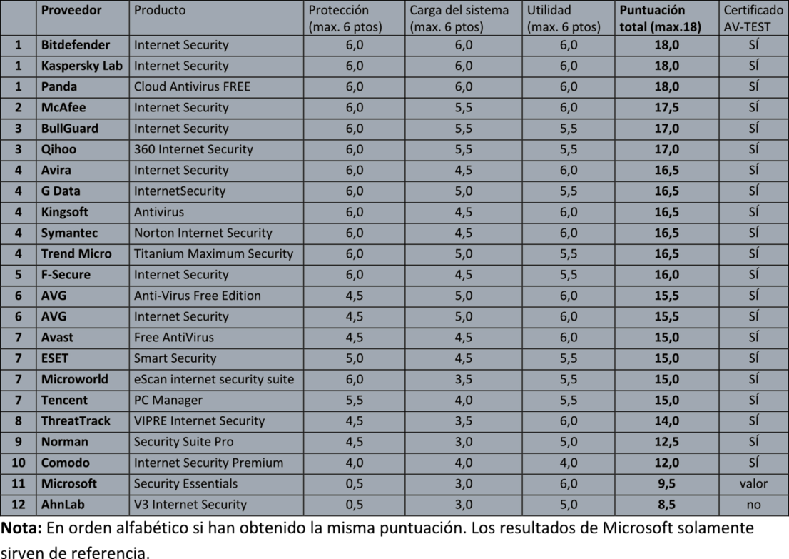 De las 23 suites de seguridad de Internet probadas, 3 alcanzaron la máxima puntuación de 18 puntos y otras 9 entre 16 y 17,5 puntos. Esto es un rendimiento muy bueno para más de la mitad de los participantes. Los tres mejores resultados los obtuvieron Bitdefender, Kaspersky Lab y Panda Cloud Free.