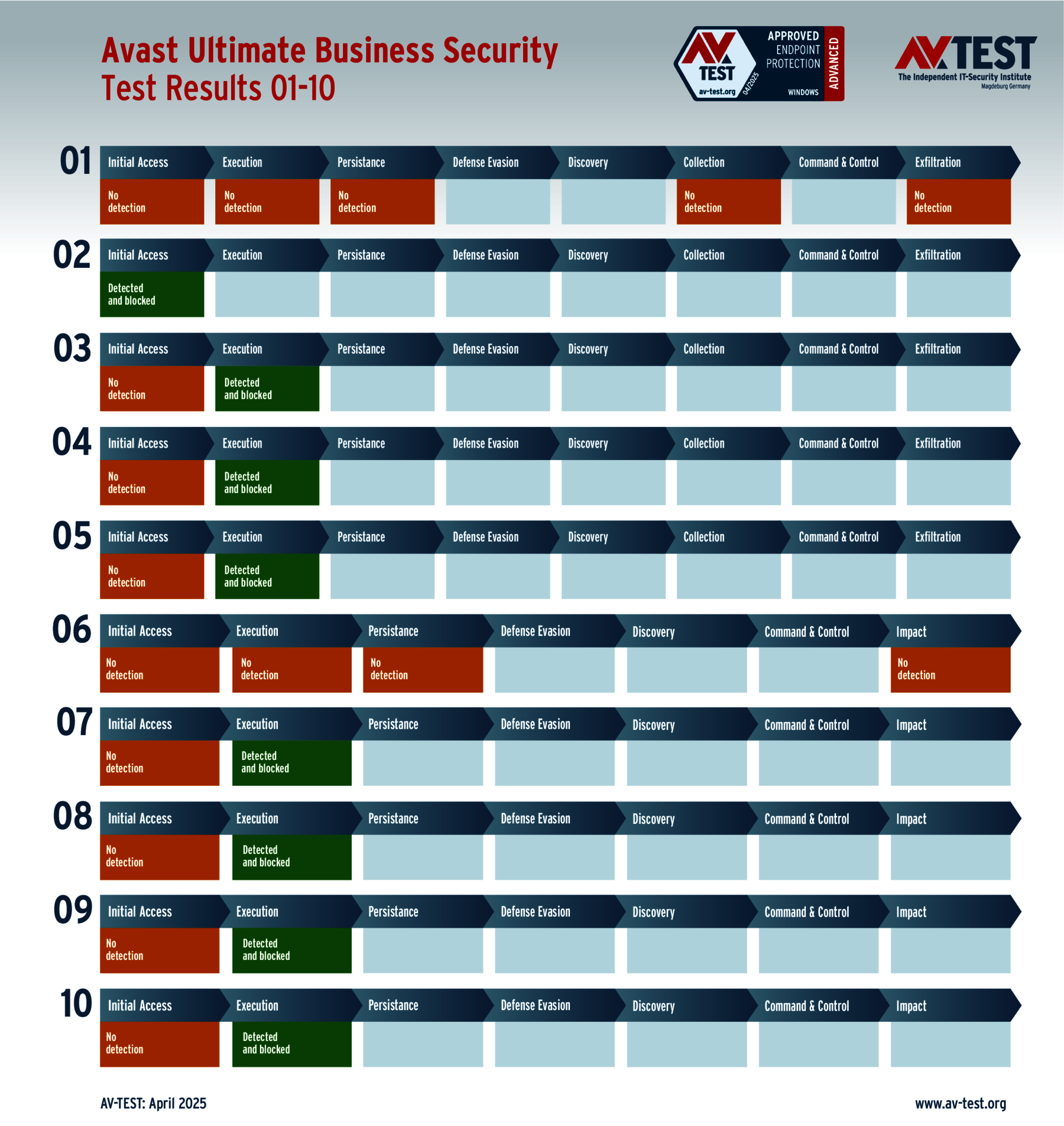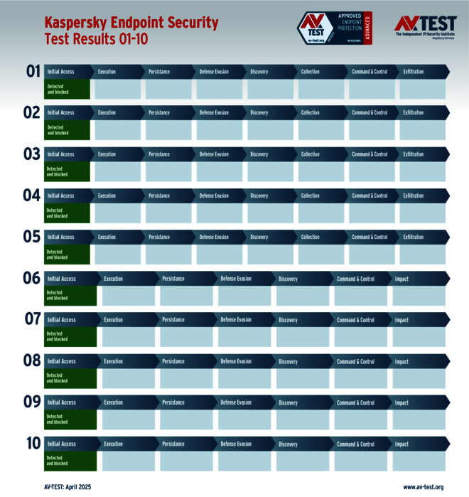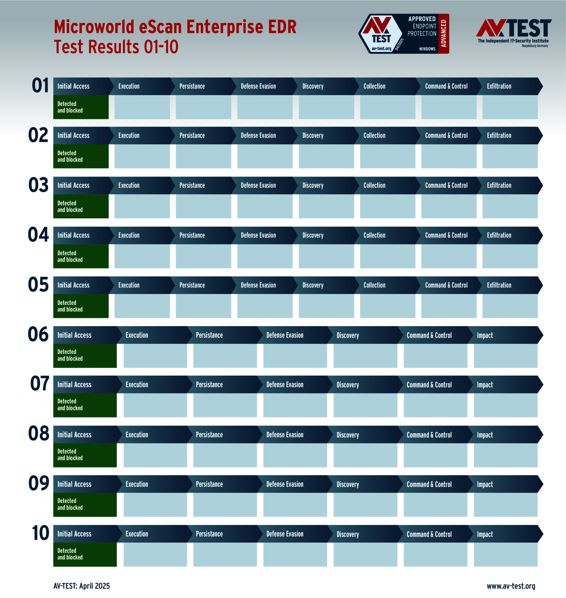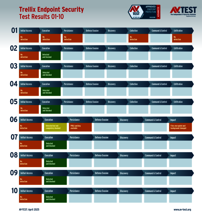 El laboratorio describe el transcurso de las acciones de defensa en una matriz basada en el estándar MITRE ATT&CK. Aunque un producto no detecte de inmediato al atacante, puede activar otras acciones de defensa posteriores y detener el ataque. La prueba muestra exactamente en qué paso lo consiguen o no.