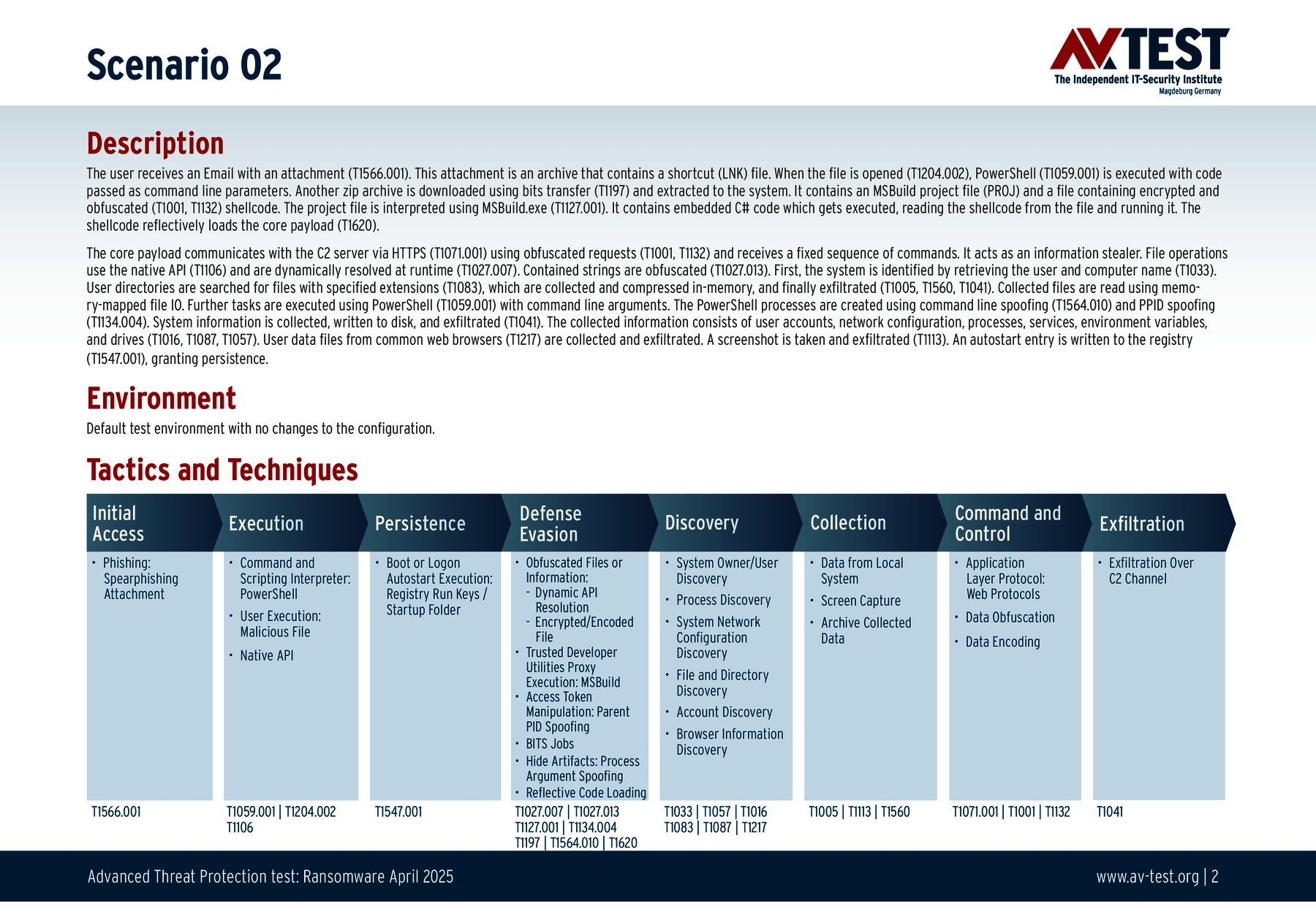 Todos los escenarios de ataque están documentados de acuerdo con los estándares de la base de datos de MITRE ATT&CK. Los diferentes subpuntos, por ejemplo “T1566.001”, aparecen en la base de datos de MITRE para “Techniques” bajo “Phishing: Spearphishing Attachment”. Cada paso de la prueba, por lo tanto, está definido por especialistas y es trazable y comprensible. Además se explican todas las técnicas de ataque y cómo se hace uso del malware en ellas.