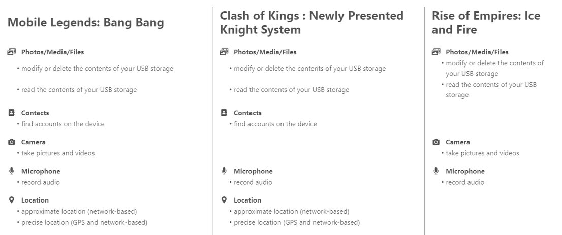 Para la investigación es muy útil la sección "Top Apps from Play Stores". Allí se encuentran listas de las principales aplicaciones o juegos, es decir, los que mayor volumen de ventas generan. Se pueden consultar los derechos exigidos por cada aplicación. De este modo se averigua enseguida, por ejemplo, que la aplicación "Mobile Legends: Bang Bang", además de otros 28 derechos, también exige el acceso al estado del teléfono y la identidad. Solo el proveedor sabe para qué.