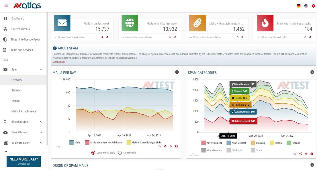 Si bien en Internet se encuentran muchas evaluaciones estadísticas, apenas aparecen fuentes de datos abiertas para la investigación. AV-ATLAS es diferente. Allí se pueden consultar gratuitamente datos en vivo relativos al volumen de malware y spam o analizar cómodamente tendencias de riegos. Los profesionales interesados incluso pueden abonarse a flujos de datos completos para el análisis.