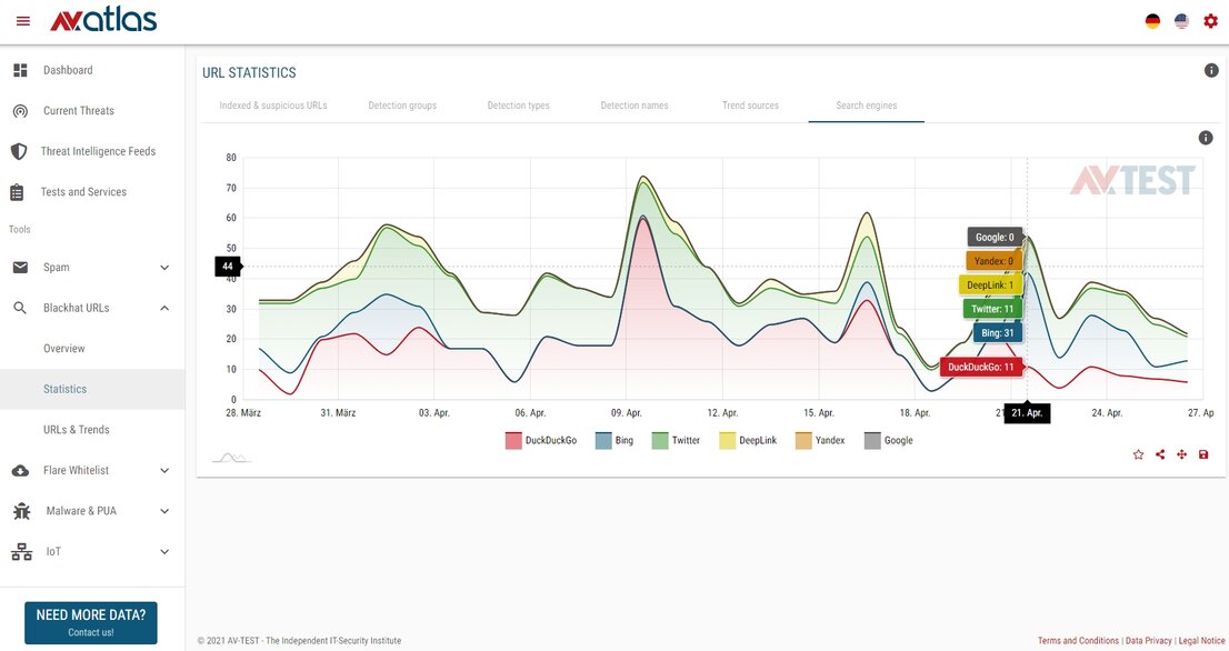 Merece la pena echar un vistazo a los "Search Engines", algo más escondidos en la sección "Statistics": allí se puede leer qué motores de búsqueda suministran la mayoría de los enlaces peligrosos a sus usuarios. Además de Google y Bing se encuentran enumerados otros como DuckDuckGo, Deeplink, Twitter y Yandex. Un breve vistazo muestra que, en el espacio cronológico del 28 de marzo al 27 de abril del 2021, el motor de búsqueda alternativo DuckDuckGo suministraba a diario enlaces infectados y que Bing también tiene dificultades una y otra vez con este tema. Google es actualmente un chico modelo y no ofrece ningún enlace infectado.