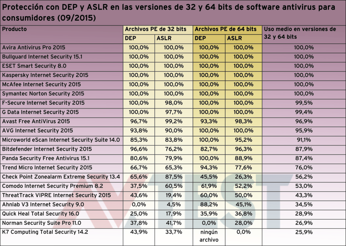 Mientras que solo una de las soluciones para usuarios privados comprobadas el año pasado contaba con un 100 por cien de protección mediante DEP y ASLR, en la prueba actual son 6 los productos que lo hacen. Los fabricantes son Avira, Bullguard, ESET, Kaspersky McAfee y Symantec. Otros dos paquetes han conseguido una valoración del 99,4 y 99,5 por ciento: F-Secure y G Data. A partir de ahí y al igual que el año pasado, la puntuación desciende poco a poco hasta el mínimo de solo un 25,9 por ciento.
