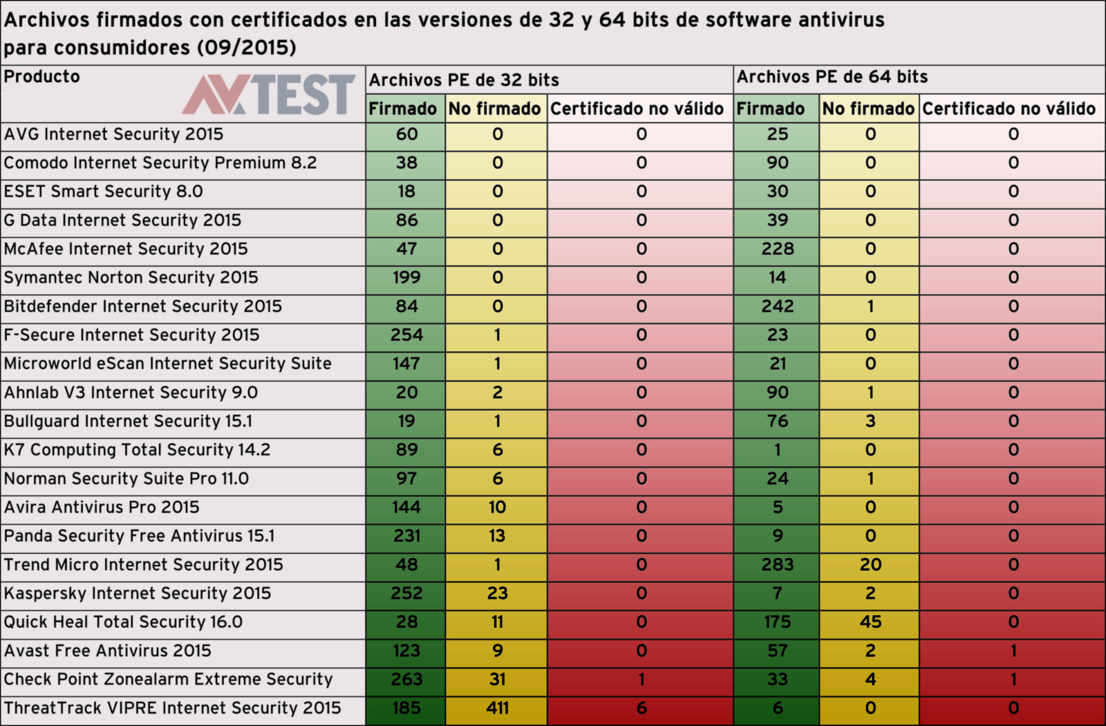 De los productos para consumidores, los de Avira, Bullguard, ESET, Kaspersky Lab, McAfee y Symantec aplican al 100 por cien las técnicas DEP y ASLR. En cuanto a la firma de los archivos, ESET, McAfee y Symantec también han hecho un buen trabajo. A Avira, Bullguard y Kaspersky aún le quedan algunos archivos por firmar, aunque no sean muchos.