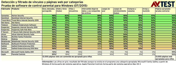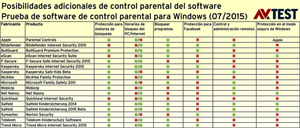 La problemática en el caso del control parental o de los módulos apropiados de las suites de seguridad en Internet radica en que no hay ningún alcance definido para las funciones estándar. Cada producto ofrece una cantidad casi inabarcable de ajustes posibles. El laboratorio solo ha seleccionado para la prueba las más importantes. Lo que está claro es que todos los productos disminuyen el riesgo de que los menores accedan a contenido inapropiado en la Web.