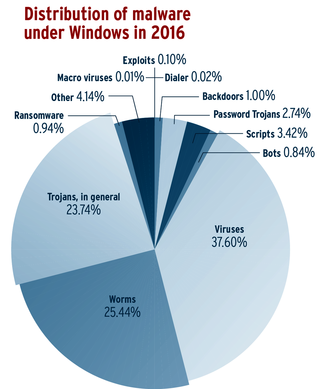 En 2016, la reducción en el desarrollo de malwares supuso un alivio cuantitativo. Al fin y al cabo, los sistemas de reconocimiento tenían que detectar y repeler un 14 por ciento menos de muestras de malware nuevas que el año anterior. El número total de programas maliciosos para todos los sistemas operativos sigue siendo, no obstante, enorme y sobrepasa actualmente los 640 millones. Windows sigue siendo el sistema operativo más atacado. El año 2016, siete de cada diez nuevos códigos maliciosos programados iban destinados a la plataforma Microsoft.