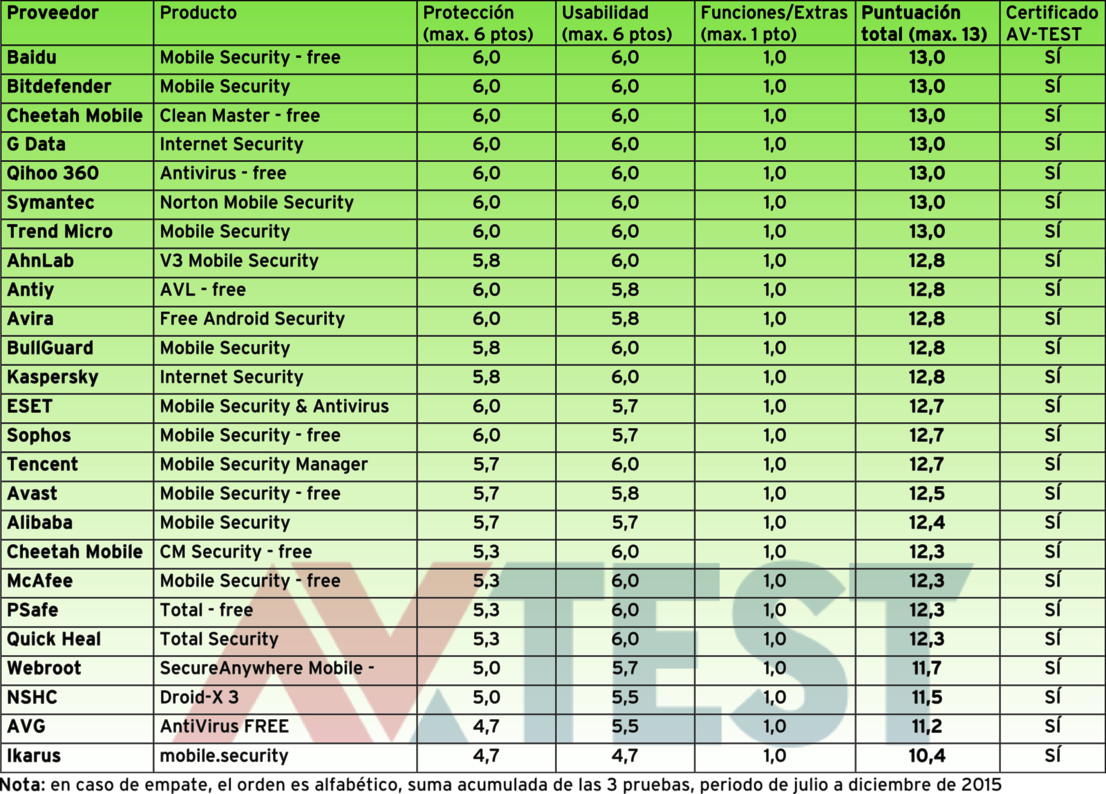 25 aplicaciones de seguridad para Android tuvieron que demostrar de lo que son capaces desde julio a diciembre de 2015. Tuvieron que detectar más de 20.000 aplicaciones infectadas, algunas con virus que solo llevaban unas horas en circulación. Solo 7 aplicaciones de seguridad consiguieron la mejor marca de 13 puntos.