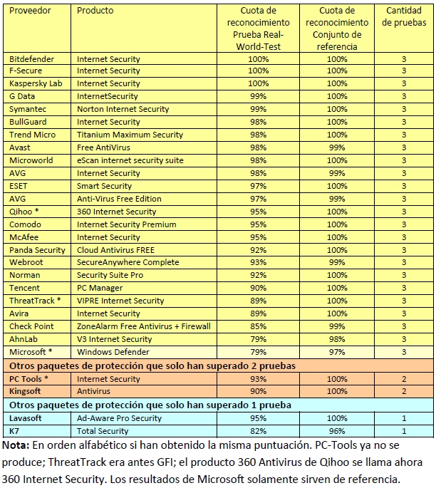 Casi la misma sucesión se manifiesta en la clasificación definitiva. Mientras que Bitdefender, Kaspersky Lab y Symantec lideran la tabla, los paquetes de protección de Avast, F-Secure y G Data comparten el cuarto puesto.