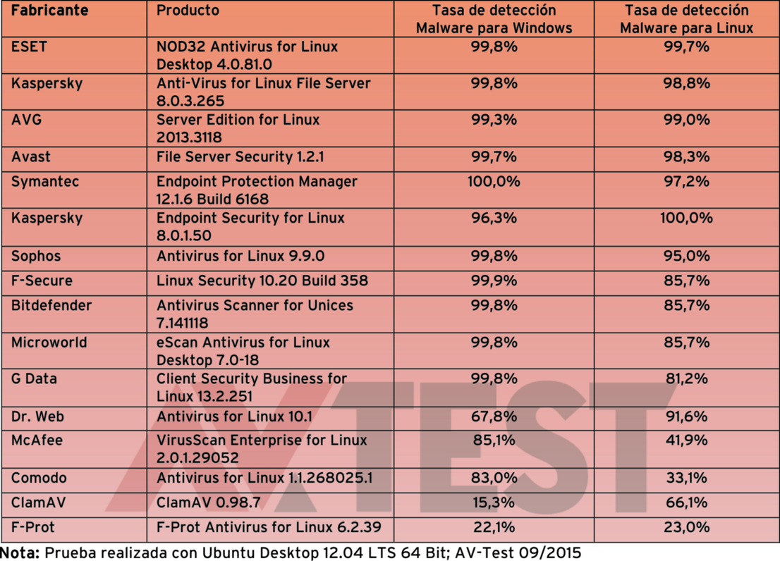 En el laboratorio de AV-TEST se evaluaron 16 soluciones de seguridad para sistemas Linux. La mayoría de las soluciones están pensadas para PCs de sobremesa, el resto para servidores. Como entorno para la prueba se usó la distribución Ubuntu, ya que es considerada la plataforma más extendida. Se utilizó la versión Desktop 12.04 LTS 64 Bit (Kernel 3.13.0-54). En la prueba participaron soluciones de seguridad para Linux de Avast, AVG, Bitdefender, ClamAV, Comodo, Dr. Web, eScan, ESET, F-Prot, F-Secure, G Data, Kaspersky Lab (con dos versiones), McAfee, Sophos y Symantec. La prueba se dividió en tres partes: la detección de malware para Windows, la detección de malware para Linux y la prueba de falsos positivos.