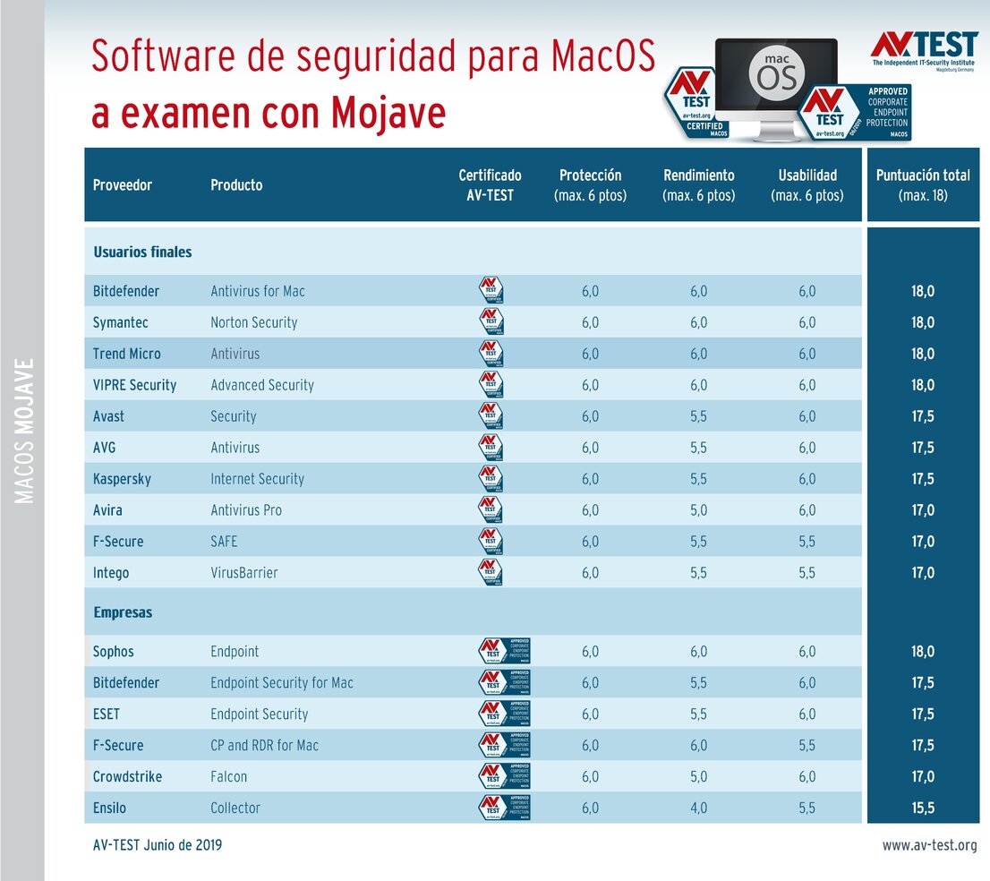Quien piense que los usuarios de Mac no son un objetivo que merezca la pena para troyanos, ransomware y compañía, se equivoca. Cada vez hay sueltos más atacantes, que AV-TEST recopila, registra y cataloga. Para aumentar la ciberseguridad de los dispositivos Mac, el mercado ofrece diversas soluciones de software de seguridad. En junio de 2019, el laboratorio de AV-TEST ha examinado muchos de estos paquetes con el nuevo MacOS Mojave: 10 de ellos van destinados a usuarios finales y 6 a su uso en empresas.