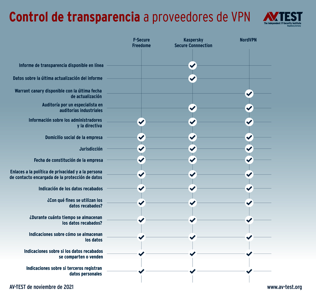 En esta prueba, los paquetes no se ordenan de acuerdo con la puntuación obtenida, esto no sería apropiado. Los paquetes examinados tienen puntos a favor y en contra dependiendo del grupo de usuarios. Si se valora la transparencia, solo Kaspersky tiene un informe de transparencia de libre acceso. Kaspersky y NordVPN ofrecen una auditoría independiente. F-Secure apuesta más por la popularidad de su nombre y la numerosa información sobre la empresa.
