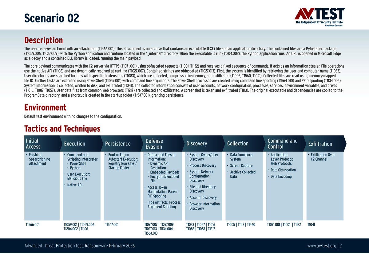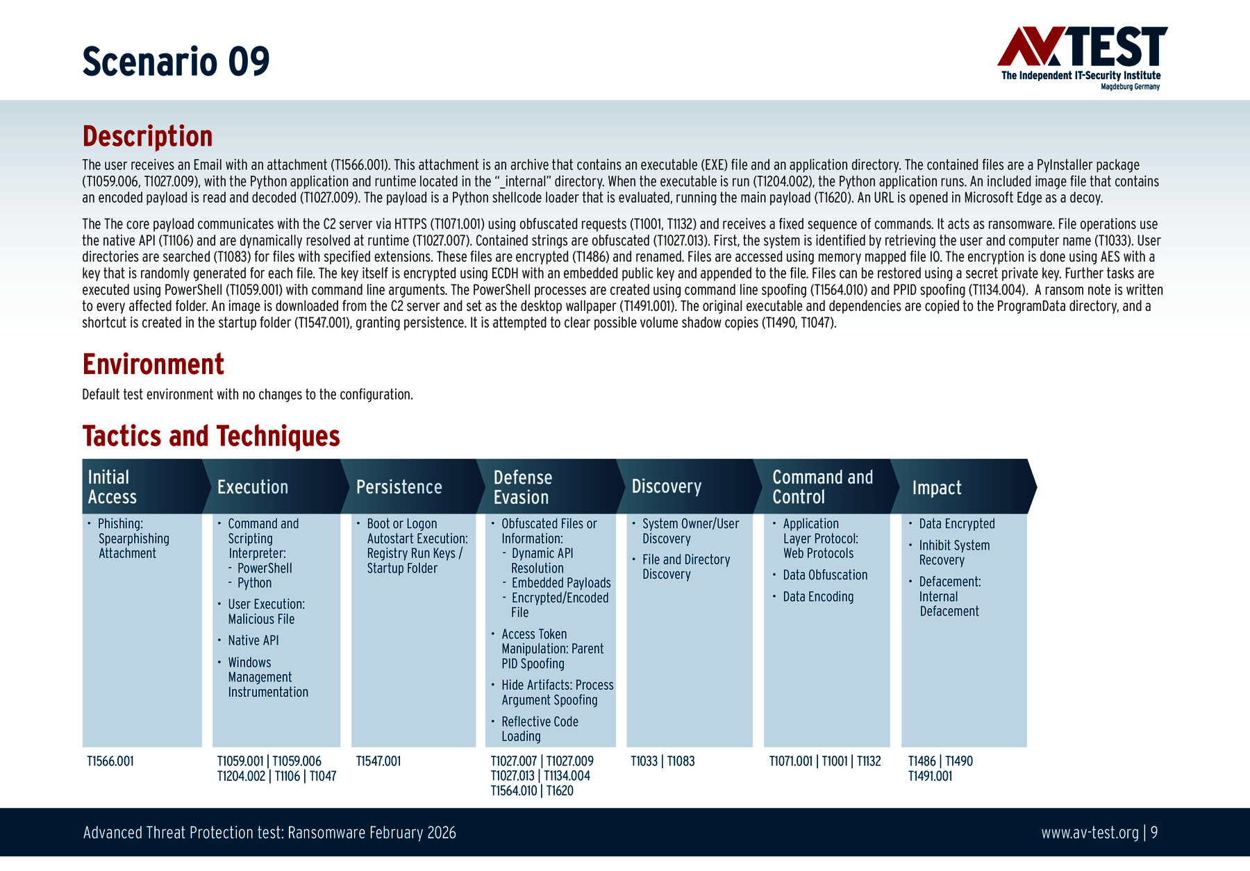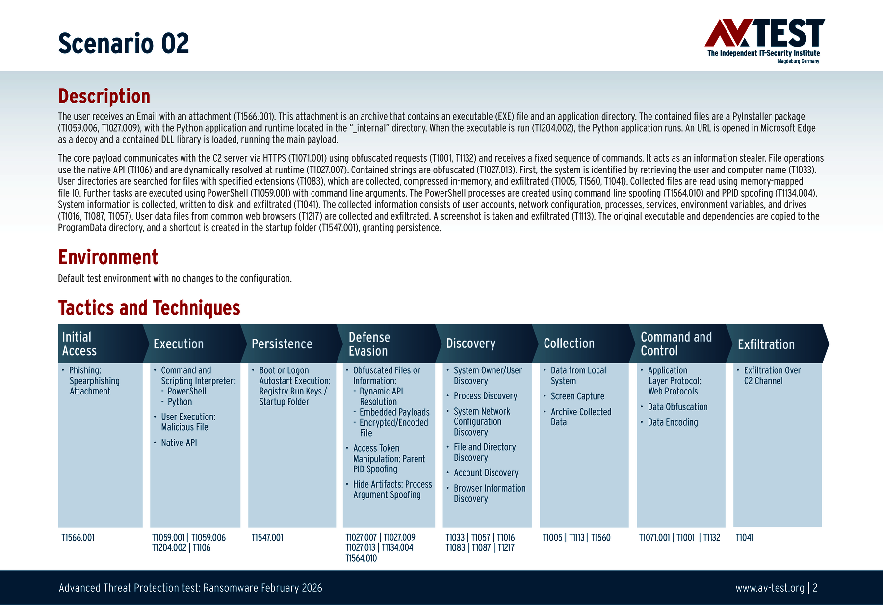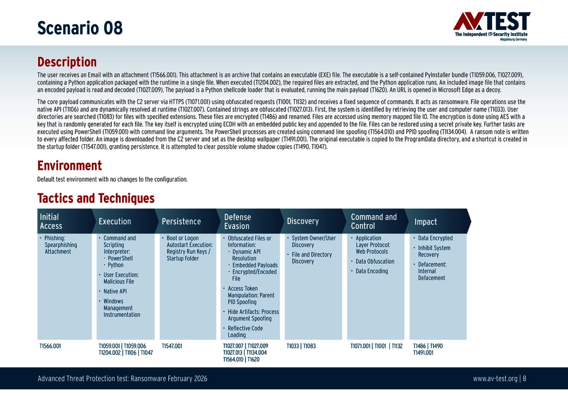 Todos los escenarios de ataque están documentados de acuerdo con los estándares de la base de datos de MITRE ATT&CK. Los diferentes subpuntos, por ejemplo “T1566.001”, aparecen en la base de datos de MITRE para “Techniques” bajo “Phishing: Spearphishing Attachment”. Cada paso de la prueba, por lo tanto, está definido por especialistas y es trazable y comprensible. Además se explican todas las técnicas de ataque y cómo se hace uso del malware en ellas y cómo el malware puede propagarse en los sistemas.