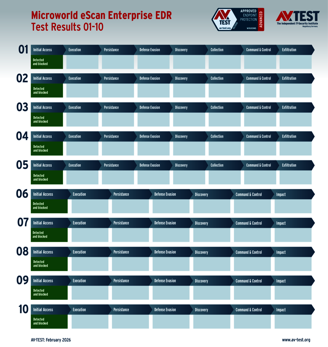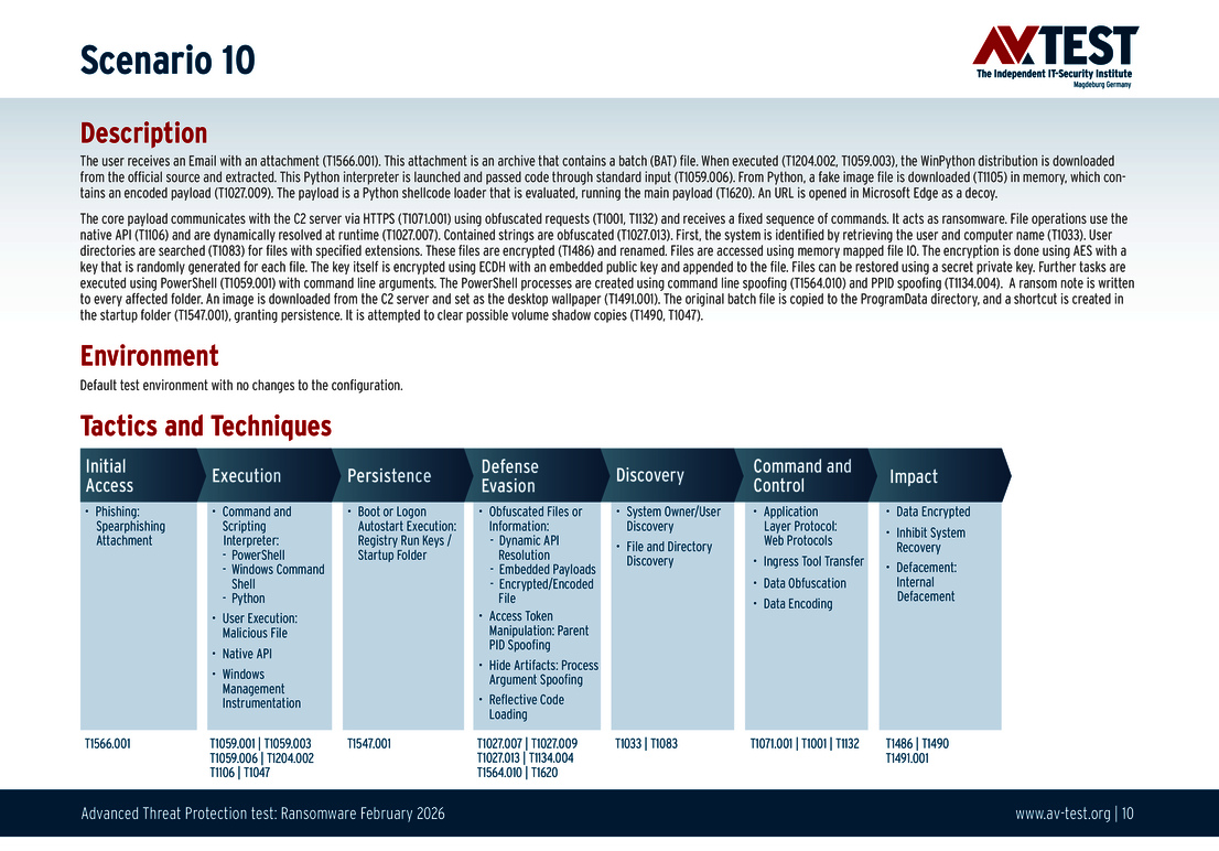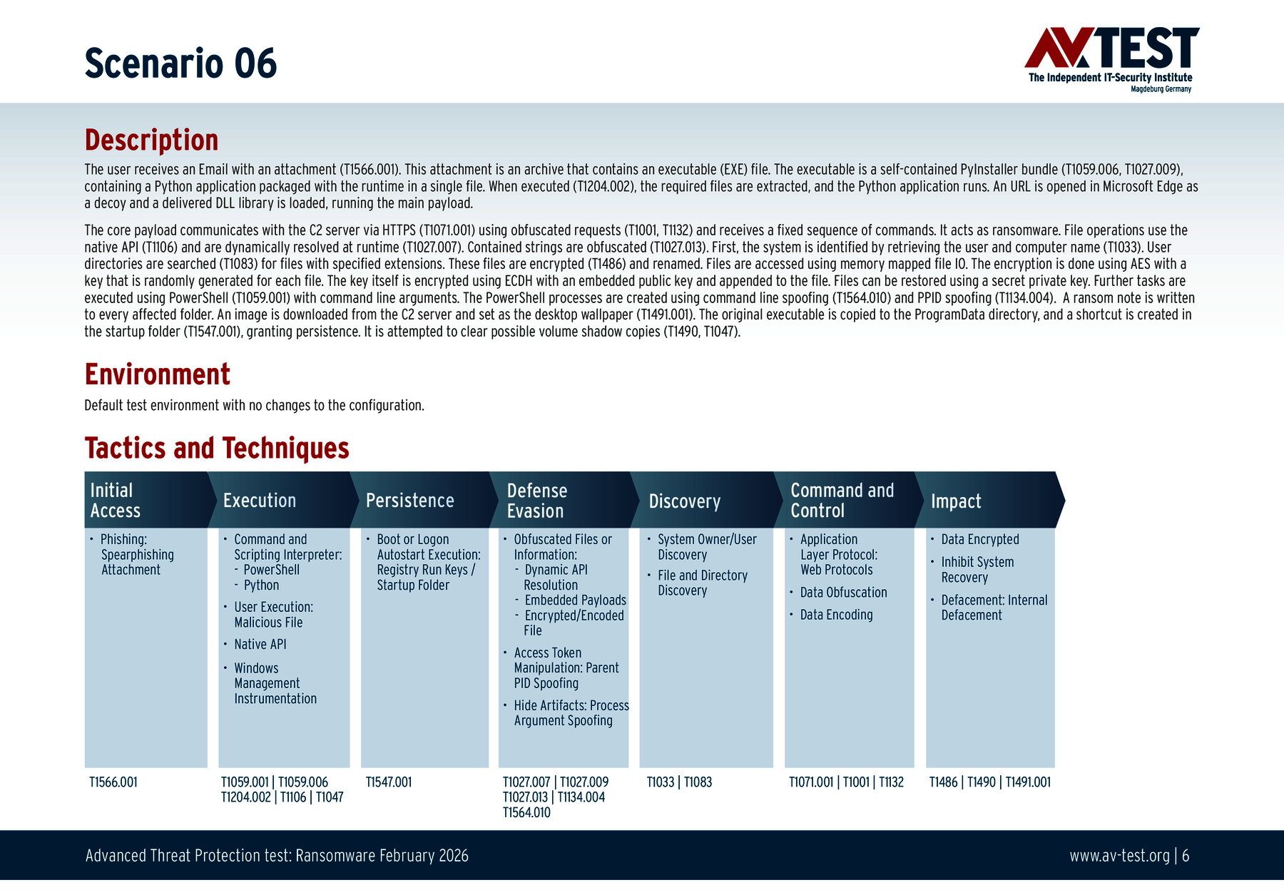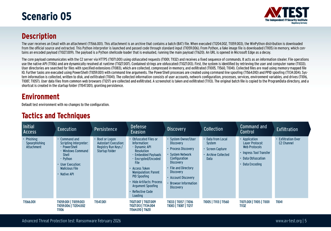 Todos los escenarios de ataque están documentados de acuerdo con los estándares de la base de datos de MITRE ATT&CK. Los diferentes subpuntos, por ejemplo “T1566.001”, aparecen en la base de datos de MITRE para “Techniques” bajo “Phishing: Spearphishing Attachment”. Cada paso de la prueba, por lo tanto, está definido por especialistas y es trazable y comprensible. Además se explican todas las técnicas de ataque y cómo se hace uso del malware en ellas y cómo el malware puede propagarse en los sistemas.