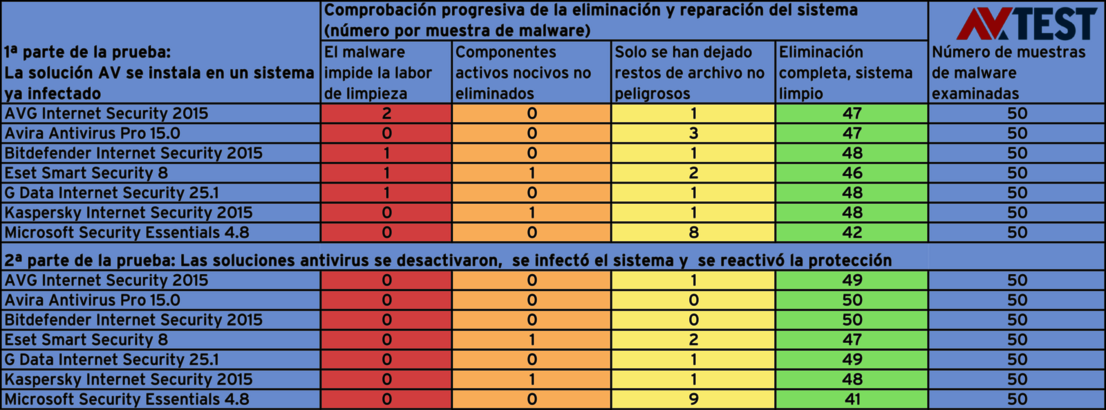 Una de las conclusiones más importantes de la prueba es que si ya hay instalada un suite de seguridad en un sistema y este es infectado, la limpieza y reparación posteriores tienen un éxito sustancialmente mayor que cuando el sistema no cuenta con un paquete de seguridad. Así, los productos de Avira y Bitdefender ya instalados pudieron limpiar y restablecer al cien por cien los 50 sistemas de prueba tras la infección. AVG y G Data lo consiguieron con 49 de los sistemas; solo en una ocasión respectivamente quedó un resto de archivo inocuo. También resultó interesante el resultado de Microsoft con su Security Essentials. Tanto preinstalado como a posteriori, en caso de emergencia, consiguió limpiar todos los sistemas de prueba y solo dejó restos de archivos no infectados en 8 y 9 ocasiones, respectivamente.