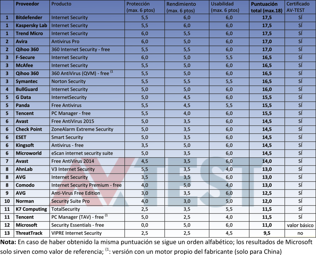 Con 17,5 puntos, los productos de Bitdefender, Kaspersky Lab y Trend Micro consiguieron casi el total de los 18 puntos posibles. Otros 7 programas también convencieron con 16 a 17 puntos y un buen rendimiento general.