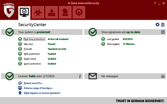 Aux mois de juillet et août 2014, AV-TEST a examiné 24 produits de sécurité destinés aux particuliers, dans leur configuration standard. Pour réaliser ces tests, les dernières versions de produits disponibles au public ont été utilisées. Grâce à la mise en jour en ligne, les versions ont pu être mises à jour à tout moment et leurs services « en nuages » étaient accessibles en permanence. AV-TEST n’a pris en compte que des scénarios de test réalistes et testé les produits par rapport aux menaces actuelles. Les produits ont dû prouver leurs capacités lors de l’utilisation de l’ensemble des fonctions et des niveaux de protection.