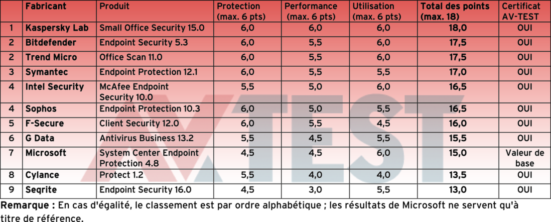 Le module de sécurité de Microsoft, System Center Endpoint Protection, a été testé à titre comparatif pour fournir un résultat de base au laboratoire. La barre à dépasser était donc de 15 points, cet objectif a été atteint par Intel Security, Sophos, F-Secure et G Data Avec 13,5 et 13/18, seuls les produits de Cylance et Seqrite n’ont pas franchi ce seuil.