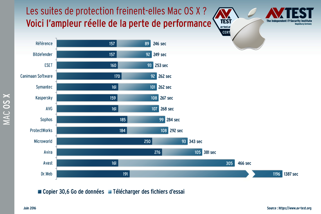 tandis que Bitdefender et ESET ne le ralentissent presque pas, Avast et en particulier Dr. Web se font remarquer par leurs mauvaises prestations.
