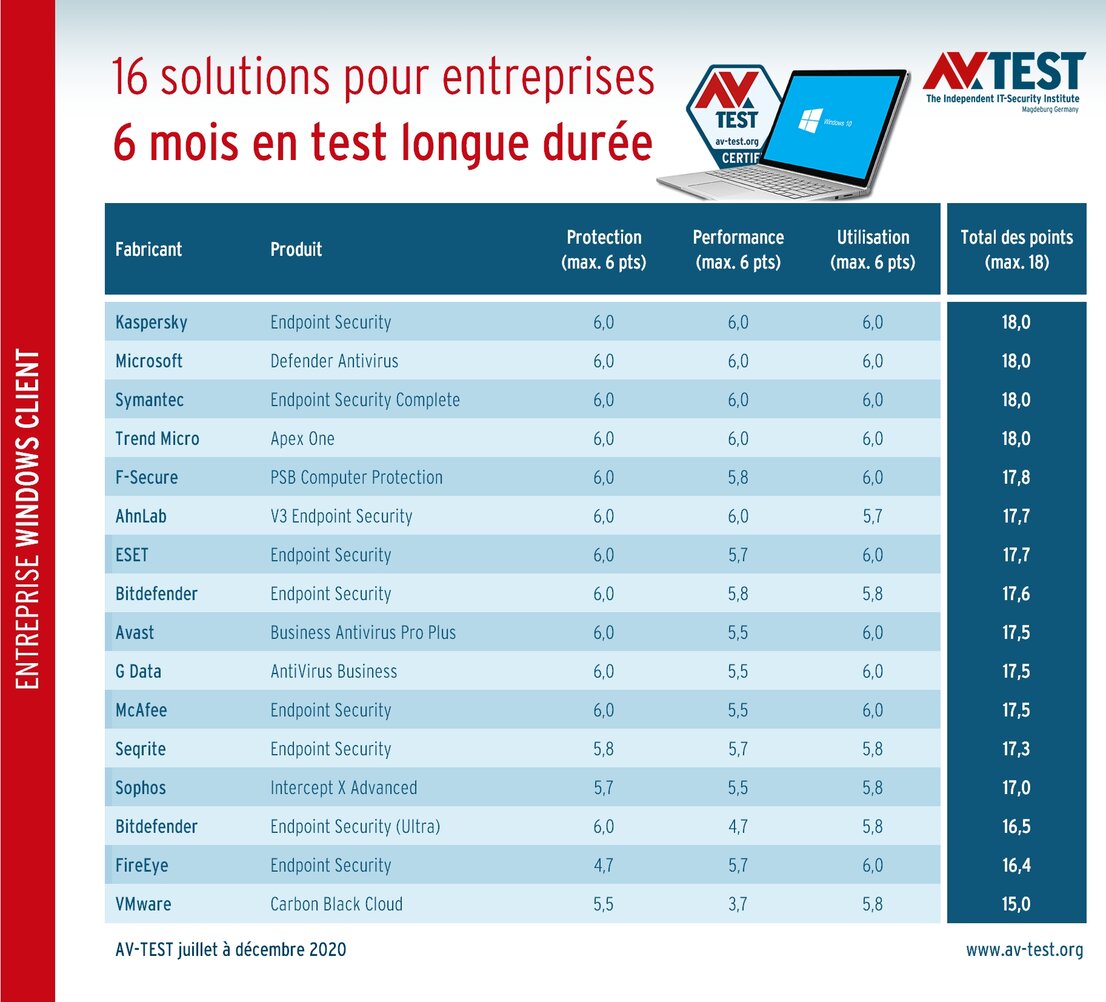 L’actuel test de longue durée effectué sur 6 mois de juillet à décembre 2020 présente toute une série de solutions de sécurité fiables destinées aux entreprises. Même sur une période de test aussi longue, les suites de sécurité des endpoints de Kaspersky, Microsoft, Symantec et Trend Micro obtiennent le nombre maximal de points dans toutes les catégories du test, soit un total de 18 points. Elles sont suivies de près par F-Secure, AhnLab, ESET et Bitdefender qui ont obtenu entre 17,8 et 17,6 points.