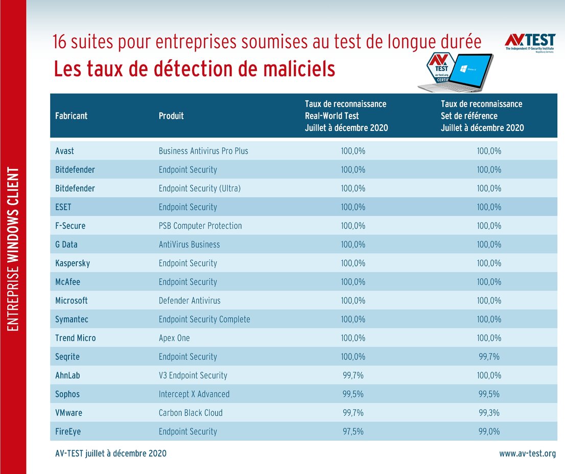 Les suites pour entreprises suivantes ont terminé les deux étapes de cet important test de protection en affichant un taux d’identification de 100 pour cent : Avast, Bitdefender, Bitdefender (Version Ultra), ESET, F-Secure, G Data, Kaspersky, McAfee, Microsoft, Symantec et Trend Micro, soit déjà 11 produits testés sur 16.