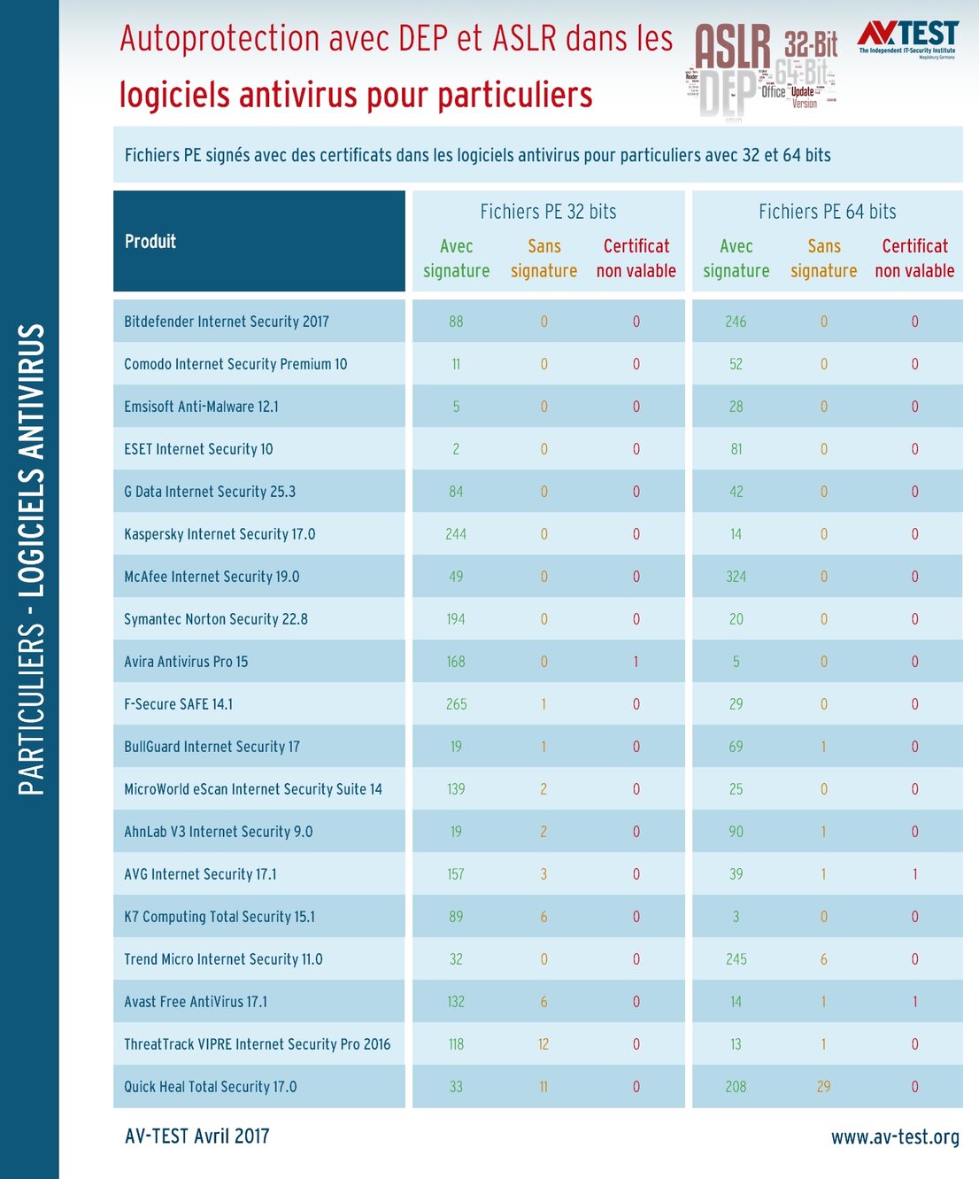 Certificats des logiciels pour particuliers : les fabricants Bitdefender, Comodo, Emsisoft, ESET, G Data, Kaspersky Lab, McAfee et Symantec utilisent des certificats valables pour absolument tous leurs fichiers PE avec 32 et 64 bits. Un grand nombre de ces fabricants font aussi partie de ceux qui utilisent l’ASLR et la DEP dans 100 % des cas. Avira, F-Secure, BullGuard, MicroWorld, Ahnlab et AVG comptent de 1 à 5 fichiers sans signature ou avec un certificat non valable. Chez Trend Micro et Avast, les testeurs ont respectivement découvert 6 et 8 fichiers dont la signature n’était pas correcte. Les produits de ThreatTrack et Quick Heal présentent même 13 et 40 fichiers non sécurisés.