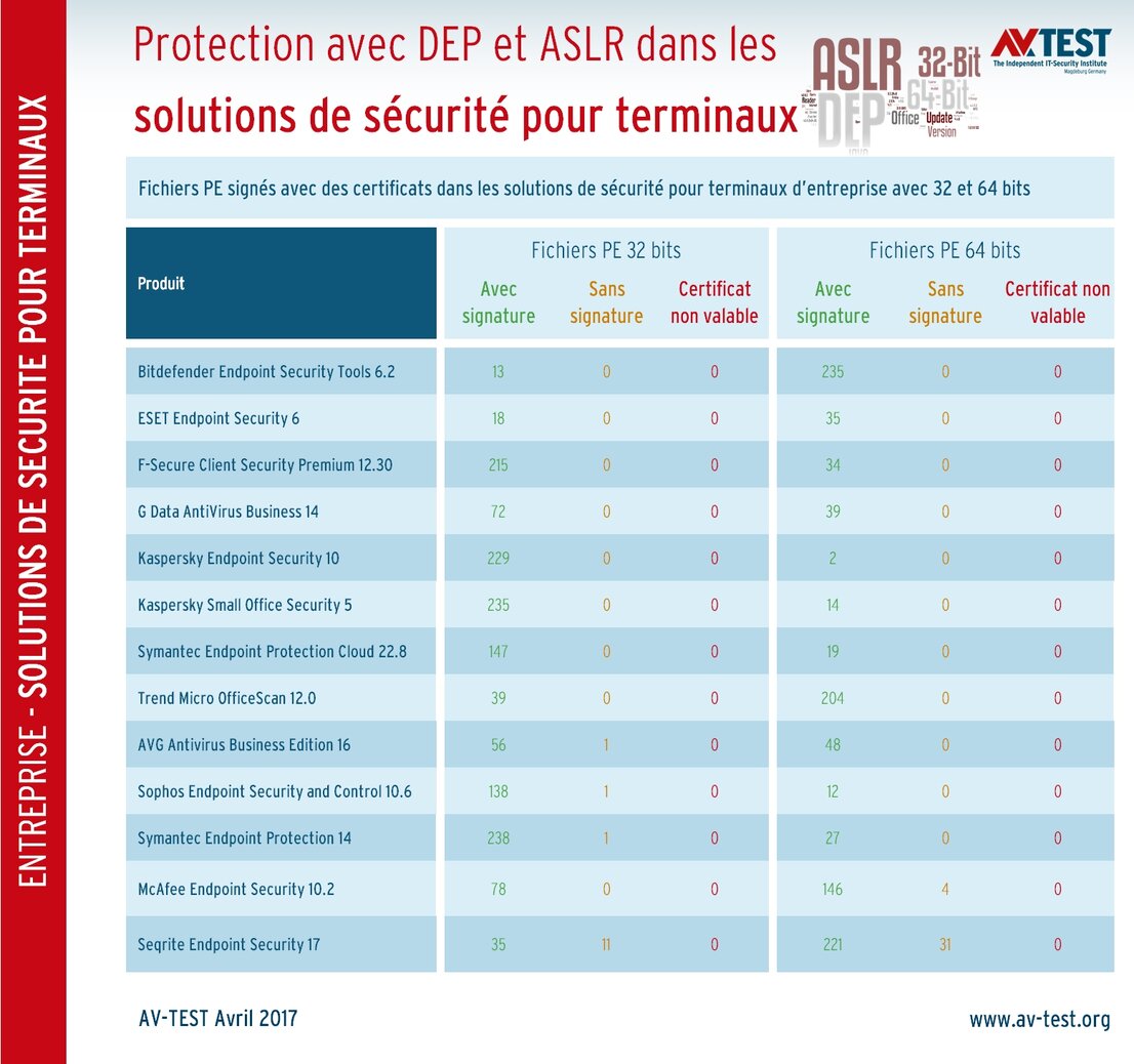 De nombreux produits utilisent la technique de l’ASLR et de la DEP pour leurs fichiers de programmes, et ce, dans les versions 32 et 64 bits. La répartition des produits pour particuliers et entreprises est précisée ci-dessous.